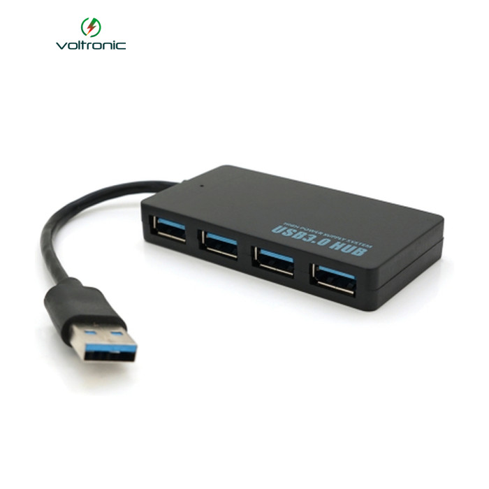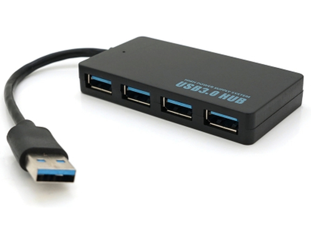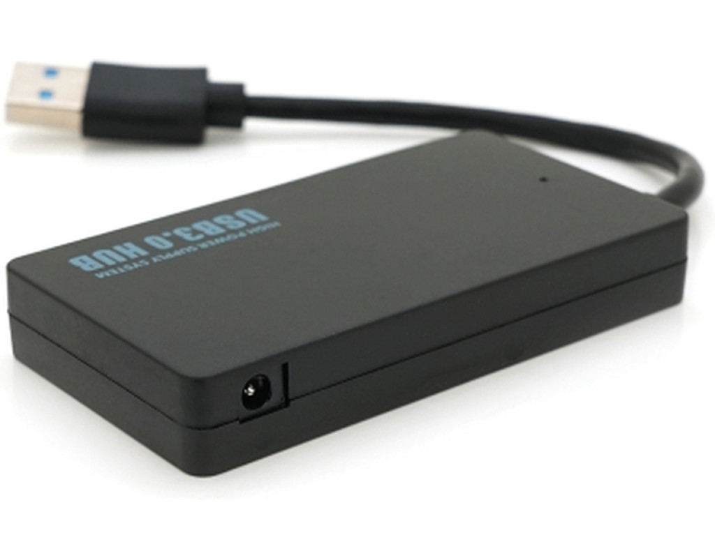 Компактный USB-концентратор с четырьмя портами стандарта USB 3.0, выполненный в плоском черном корпусе. Устройство позволяет расширить возможности подключения периферийных устройств к компьютеру или ноутбуку, поддерживая накопители объемом до 2ТБ.