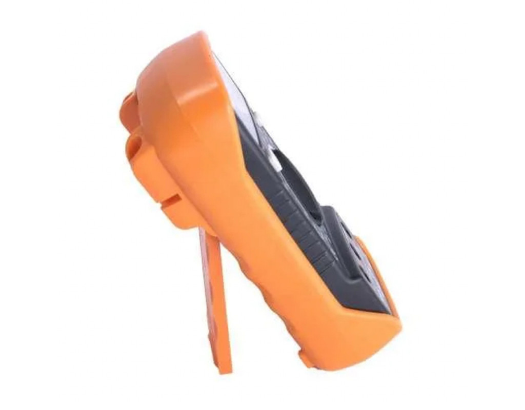 Мультиметр выполнен в прямоугольном корпусе. Сверху на корпус одет защитный прорезиненный чехол. На передней поверхности расположен большой ЖК экран с яркой подсветкой. Разрядность дисплея 2000 отсчетов. Под дисплеем находятся кнопка удержания резкльтата измерения и кнопка включения подсветки экрана. Ниже расположен большой круглый переключатель для выбора основных режимов и диапазонов измерения. Он легко переключается и надёжно фиксируется. Все надписи и обозначения качественные и легко читаемые. Ниже находятся 4 входа для подключения щупов: