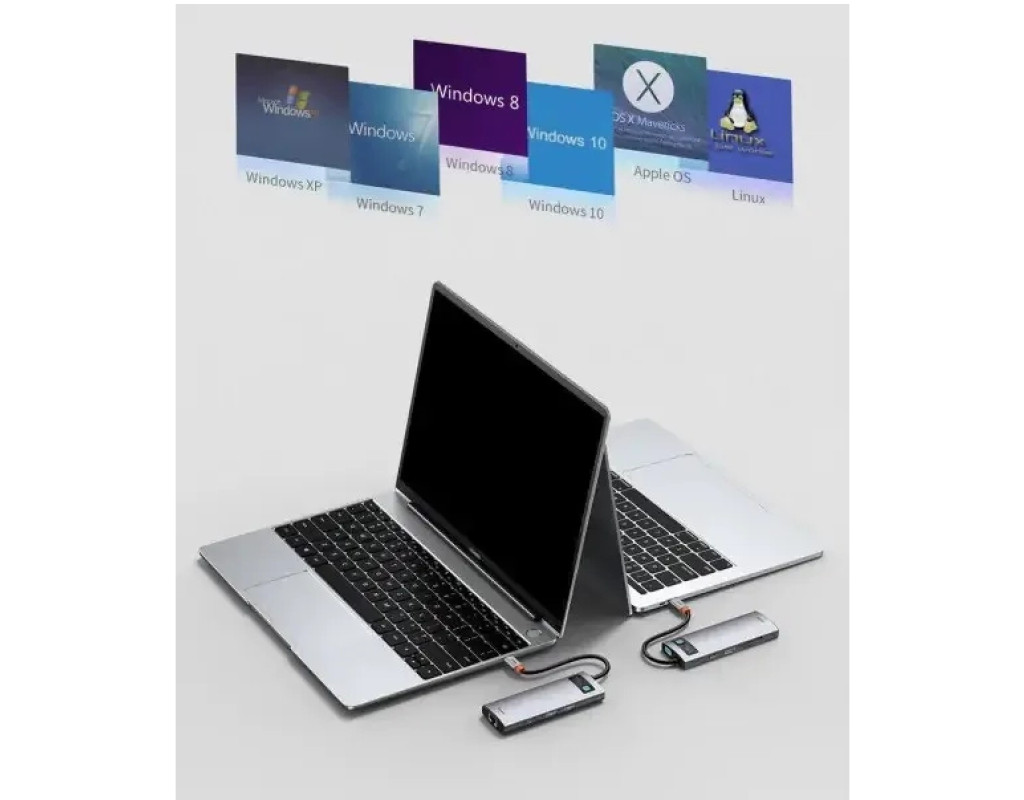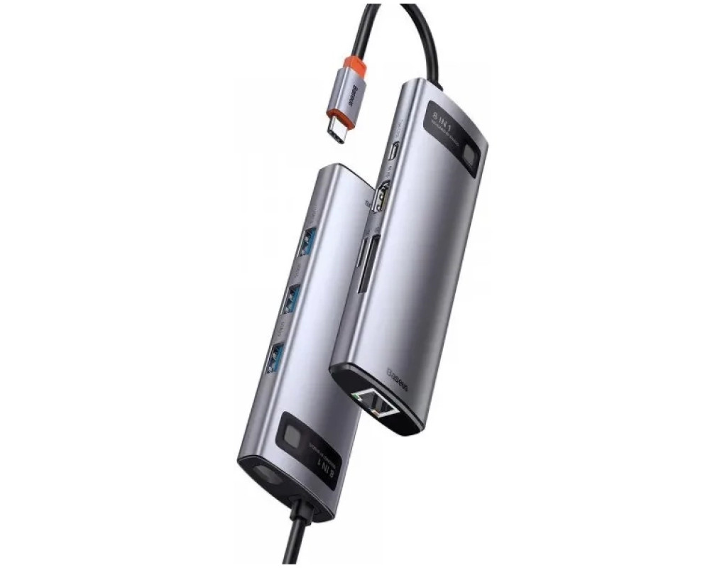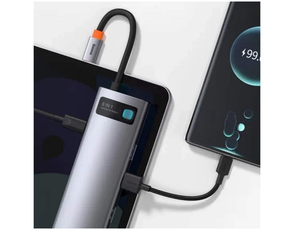 | Під'єднуйте більше пристроїв USB-хаб Baseus Metal Gleam допоможе вам розширити можливості вашого ноутбука та збільшить кількість роз'ємів. Роз'єми USB 3.0 дадуть вам під'єднувати інші ґаджети, як-от флешнакопичувачі, мишку, клавіатуру тощо. А наявність порту USB-C (PD) дасть змогу паралельно заряджати ваш ноутбук із максимальною потужністю 100 Вт. Під'єднуйте монітор, проєктор, телевізор та відтворення відео або презентації на великому екрані завдяки роз'єму 4K HD. Захисні властивості Конструкція хаба створена з алюмінію, який має високу міцність і забезпечує зносостійкість пристрою. Хаб обладнаний системою захисту від перевантаження, перегрівання або замикання, що додатково захищає ваші ґаджети від непередбачених ситуацій. 2 слоти для картки Завантажуйте файли та світлини на комп'ютер одночасно з двох карток: TF та SD. Швидкість передавання становить приблизно 60 Мб/с. Особливості: