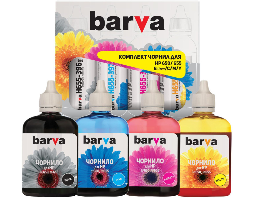 Комплект чорнил для принтерів HP. Складається з чотирьох баночок різних кольорів: чорного, малинового, синього та жовтого. Об’єм однієї місткості — 90 грамів. Такої кількості фарби вистачить для друку значного обсягу документів та фотографій. Друк фото краще здійснювати на спеціальному фотопапері. Чорнила можна використовувати для картриджів струменевих принтерів, СБПЧ та ПЗК. Вони сумісні з чорнилами багатьох інших виробників. |