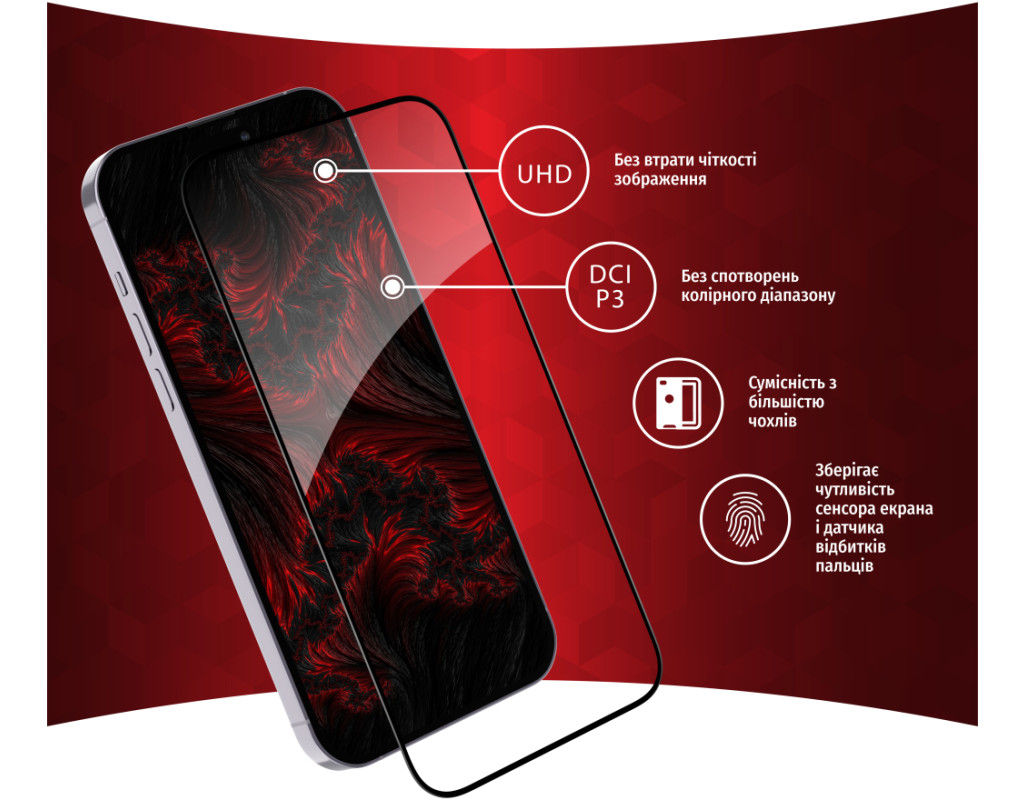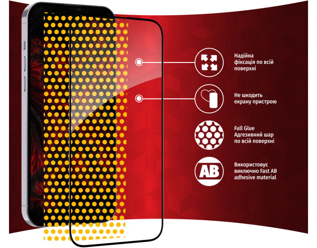 • Клейовий шар нанесений на всьому склі. Завдяки цьому, забезпечує надійну та сильну фіксацію всього скла, а не лише його країв. У разі потреби таке скло можна легко зняти без ризику пошкодити екран або його покриття.