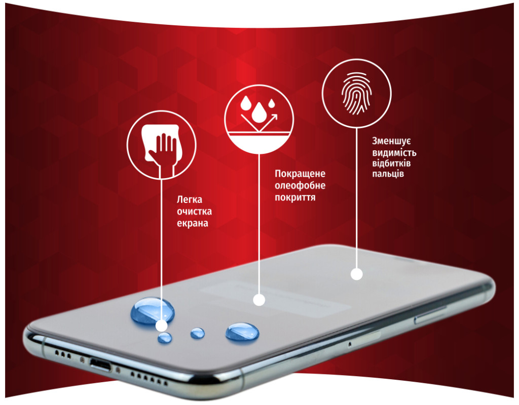 • Олеофобне покриття. Має водовідштовхувальні, жиростійкі й антикорозійні властивості. Зменшує видимість відбитків пальців і дає змогу легко чистити екран.