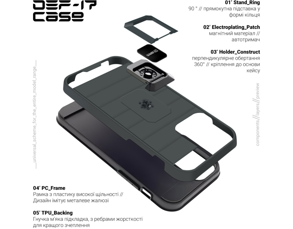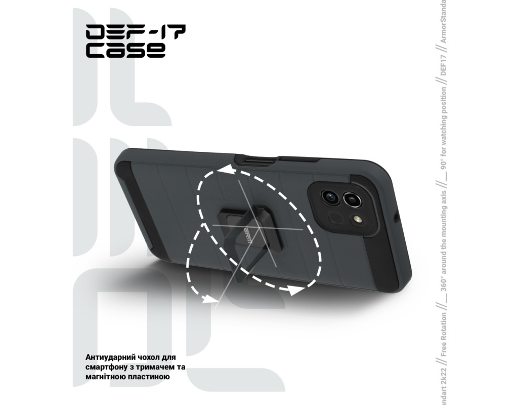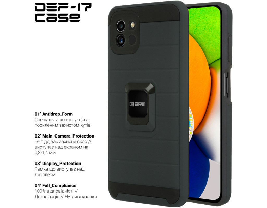 Чехол ArmorStandart DEF17 case - прочная и надежная защитная панель для смартфона. Обновленная конструкция чехла защитит смартфон более надежно. Внутренняя часть конструкции сделана из силикона с ребрами жесткости для большего сцепления с телефоном. Выступающие бортики над дисплеем и задней камерой защитят от царапин. Внешняя часть конструкции состоит из прочного пластика высшего качества и послужит дополнительным щитом при падении гаджета. На задней части панели также есть кольцо-держатель, которое в то же время служит и магнитным авто держателем. Кольцо вращается на 360 градусов и может служить подставкой для смартфона. Особенности: