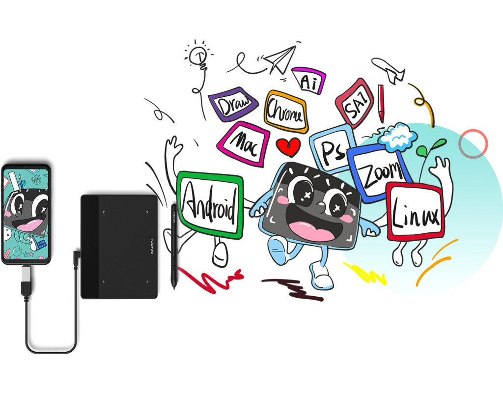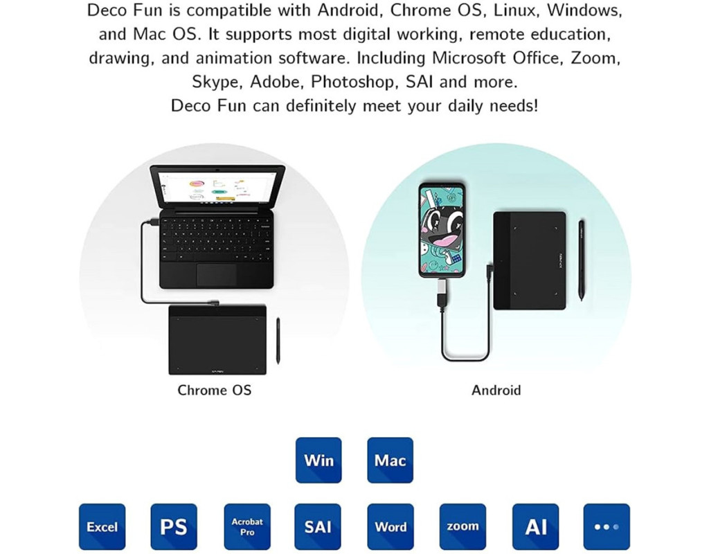 Deco Fun сумісний з операційними системами Android, Chrome OS, Linux, Windows та MacOS. Він підтримує більшість програм для цифрової роботи, дистанційного навчання, малювання та анімації, включаючи Microsoft Office, Zoom, Skype, Adobe Photoshop, SAI та інші. І точно задовольнить усі ваші творчі бажання!