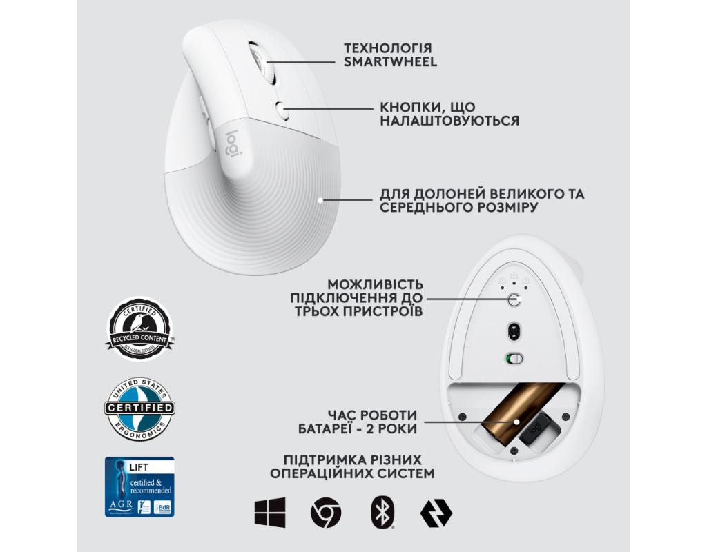 | Мишка Logitech Lift Vertical Ergonomic Wireless/Bluetooth for Business Off-white (910-006496) - це інноваційне рішення для тих, хто цінує комфорт та здоров'я під час роботи. Ця вертикальна ергономічна миша створена для максимального зниження напруги в м'язах зап'ястя і передпліччя, завдяки природному положенню кисті, яке імітує рукостискання. Зокрема, вона ідеально підходить для власників маленьких і середніх рук, забезпечуючи комфорт навіть при тривалій роботі. Бездротове підключення миші забезпечується через USB адаптер 2.4 ГГц та Bluetooth, що гарантує надійне і швидке з'єднання. Сучасна технологія Logi Bolt пропонує безпечні рішення для офісних і віддалених користувачів, забезпечуючи стабільну роботу навіть у перевантажених бездротових середовищах. Завдяки SmartWheel, ви зможете швидко перегортати великі документи, зберігаючи при цьому точність. Режими прокрутки перемикаються легким дотиком, що робить процес роботи плавним та безшумним. Для IT-адміністраторів миша пропонує розширені можливості з налаштування та управління через програмне забезпечення Logi Options+. Це програмне забезпечення дозволяє віддалено керувати оновленнями та налаштуваннями множинних пристроїв, одночасно підтримуючи Windows та macOS. Крім того, миша має п'ять кнопок, чотири з яких можна налаштувати під ваші потреби, що підвищує ефективність у повсякденній роботі. Її живлення здійснюється за допомогою однієї батарейки типу AA, що забезпечує тривалий період роботи. Висока якість збірки, стильний білий колір, компактні розміри 108 × 71 × 70 мм і зручна вага 125 г роблять цю мишу не лише функціональним, але й естетичним доповненням до вашого робочого простору. Виберіть Logitech Lift для покращення вашого комфорту та продуктивності на роботі. |