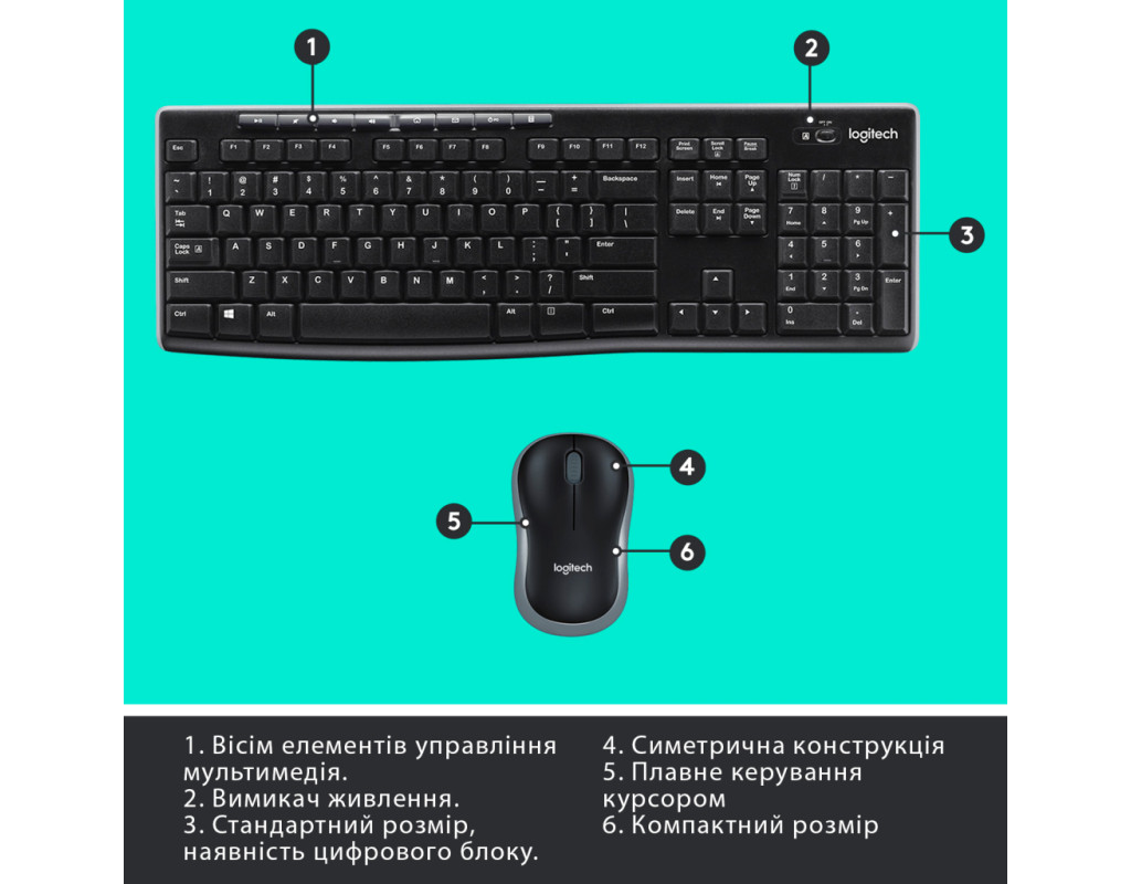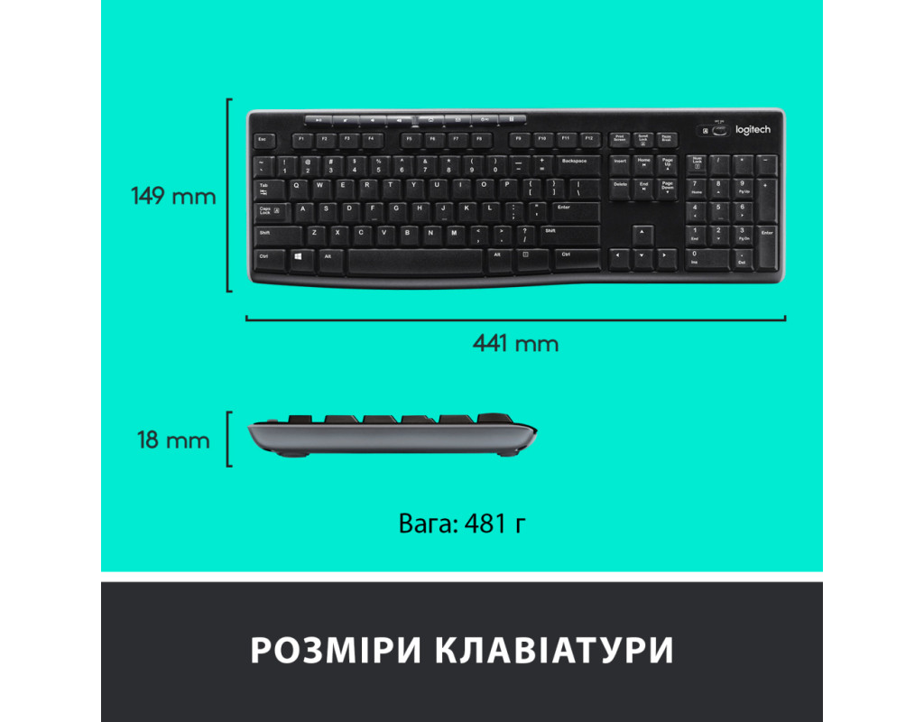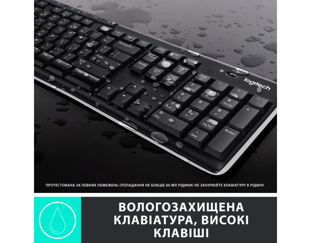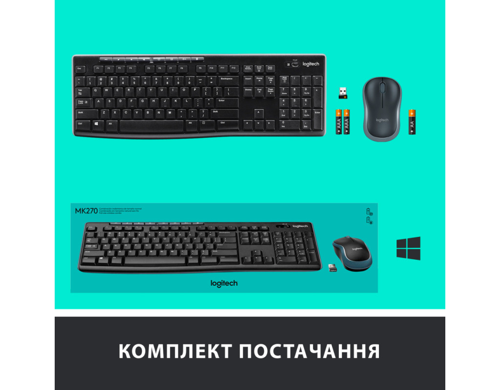 Компактний комплект клавіатури з мишею Logitech Wireless Combo MK270 поєднує зручність бездротової технології з надійністю на рівні дротового з'єднання. Удосконалена технологія бездротового зв'язку на частоті 2.4 ГГц Можна працювати та грати де завгодно, наприклад на дивані, — бездротовий зв'язок дає змогу практично унеможливити будь-які затримки, збої та перешкоди під час роботи в радіусі 10 метрів. Простота технології Plug-and-Play Налаштування триватиме всього кілька секунд — досить просто вставити бездротовий приймач в USB-порт комп'ютера, щоб розпочати роботу з клавіатурою й мишкою без жодного програмного забезпечення. Вологозахищена клавіатура Рідина витікає з клавіатури, даючи змогу не турбуватися про пошкодження обладнання через випадкове потрапляння рідини. Вісім спеціальних клавіш Те, що потрібно найчастіше, — завжди під рукою завдяки восьми спеціальним клавішам для швидкого доступу до Інтернету, електронної пошти, а також функцій відтворення, паузи, регулювання гучності тощо. Компактна клавіатура для зручності роботи Елегантна клавіатура займає мало місця і зручна в роботі завдяки повнорозмірним клавішам і широкій фігурній клавіші пропуску. Надійність Logitech Користувачі оцінять високу якість і надійність, які зробили компанію Logitech світовим лідером у виробництві клавіатур і мишей. Надійні клавіші з УФ-покриттям Спеціальне покриття захищає клавіші від зношення, і вони зберігають новий вигляд упродовж довгих років. Вимоги до системи: Windows XP, Windows Vista, Windows 7 або Linux з ядром версії 2.6 або новішої версії, USB-порт. Комплектація: - Клавіатура