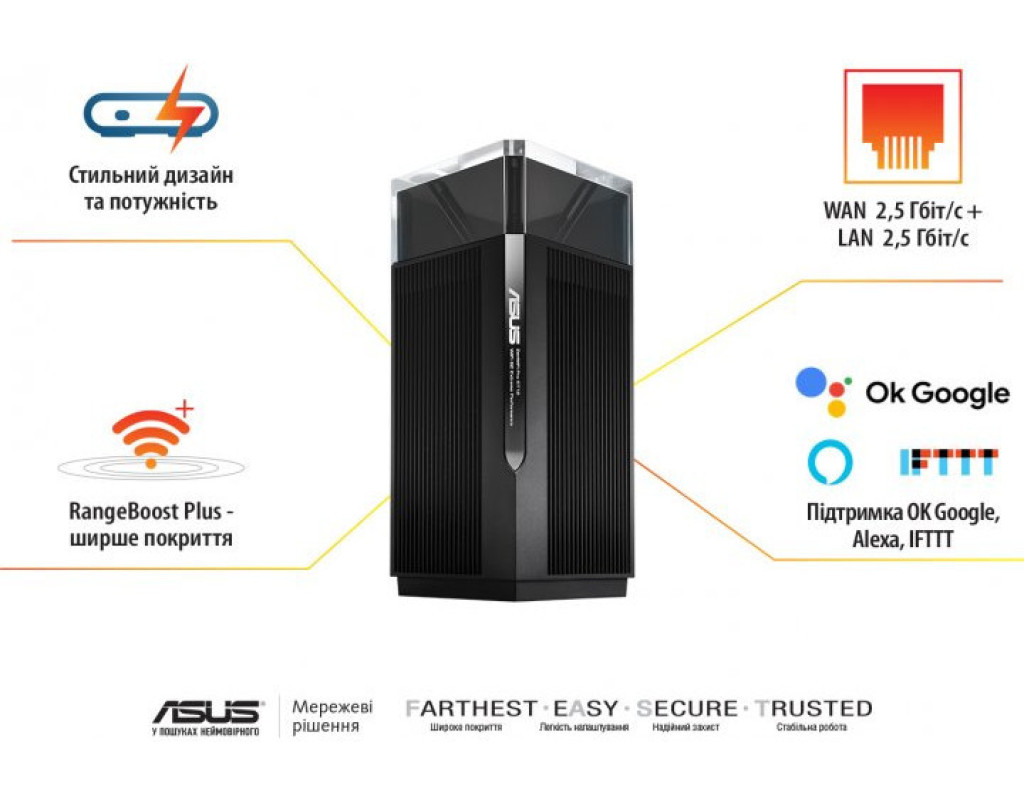 | Маршрутизатор ASUS ET12(2-PK) - це сучасне рішення для покриття мережею Wi-Fi всього вашого будинку, що поєднує у собі високу продуктивність, розширену функціональність та стильний дизайн. Працюючи у системі Wi-Fi 6E, цей маршрутизатор виводить можливості ваших мереж на новий рівень, забезпечуючи безперебійну роботу для продуктивних завдань та цифрових розваг. Неперевершена швидкість і пропускна здатність - ZenWiFi Pro ET12 підтримує до 12 потоків з максимальною швидкістю передачі даних до 11000 Мбіт/с. Він розроблений для найбільш завантажених домашніх мереж, де висока швидкість і надійність є критично важливими для задоволення потреб великої кількості пристроїв. Завдяки вбудованим антенам, пристрій забезпечує швидкість Wi-Fi до 2402 Мбіт/с на частотах 2.4/5 ГГц, усуваючи мертві зони у вашому приміщенні. Підтримка MESH та розширене покриття - технологія ASUS AiMesh дозволяє легко додавати додаткові вузли для покращення покриття Wi-Fi у вашому будинку. Використовуйте будь-який AiMesh-сумісний маршрутизатор як вузол для масштабування розміру та функціональних можливостей вашої мережі. Інноваційні порти LAN і WAN - завдяки LAN- та WAN-портам стандарту 2.5G Ethernet, ZenWiFi Pro ET12 забезпечує повну швидкість 2.5 Гбіт/с по всьому шляху від вашого інтернет-провайдера до сумісних пристроїв. Це означає, що ви зможете насолоджуватися високошвидкісним інтернет-з'єднанням у всьому будинку. Захищеність і безпека - ZenWiFi Pro ET12 оснащений системою AiProtection Pro, що надає безкоштовний захист від онлайн-загроз без абонентської плати. Він підтримує стандарт WPA3 та можливості батьківського контролю, що забезпечує максимальну безпеку вашої мережі. Технологія Instant Guard дозволяє створити захищене з'єднання, будь-де ви не були, використовуючи домашній VPN. Голосове управління для вашої зручності - ZenWiFi Pro ET12 сумісний із голосовими сервісами Google та Alexa, дозволяючи керувати налаштуваннями маршрутизатора за допомогою голосових команд. Маршрутизатор ASUS ET12(2-PK) це досконале поєднання інноваційних технологій та потужності, що забезпечить вам безперебійний і безпечний Wi-Fi-зв'язок у будь-якій частині вашого дому. Оберіть ASUS ET12 для гарантованої якості та надійності. |