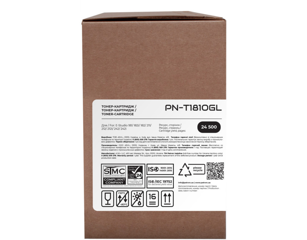 | Основні властивості Оптимальний варіант для користувача, що хоче заощадити; При виробництві картриджа використовується новий корпус; Гарантований ресурс; Економія 70-80% у порівнянні з оригінальними витратними матеріалами; Виробник додержується стандартів ISO 9001:2015, ISO 19752:2017, ISO 19798:2017 та STMC; Продукт українського виробника. Детальна інформація: Що таке сумісний картридж? Кожен користувач друкувальної техніки стикається з питанням купівлі нового картриджа і знаходить досить велику кількість пропозицій. Як зробити правильний вибір? Розглянемо основні варіанти: Виробники друкувальних пристроїв (т.з. OEM виробники) наполягають на використанні оригінальних картриджів. Їх основний недолік - висока вартість. Сумісні картриджі виробляються різними компаніями - сторонніми виробниками. Вони дають можливість істотно заощадити на друці, проте питання оптимального балансу між якістю друку, ціною, гарантією та ресурсом картриджа залишається вибором Покупця. Тонер-картридж сумісний Konica Minolta TN414 Green Label Patron (PN-TN414GL) гарантія Ми гарантуємо 12 місяців справної роботи картриджа та проведемо заміну продукції з виробничим дефектом. Якість друку Картриджі серії Patron Green Label виготовляються з використанням нових корпусів та повністю придатні для повторної заправки. Основна відміна серії Patron Green Label від картриджів низького цінового сегменту – якість комплектуючих, що забезпечує високу оптичну щільність друку, а також ресурс, аналогічний оригінальному картриджу. При виробництві картриджів Patron Green Label виробник дотримується загального стандарту ISO 9001:2015 і спеціальні стандарти, що використовуються в індустрії друку - ISO 19752:2017 для монохромних картриджів ISO 19798:2017 - для кольорових картриджів, а також STMC стандарт для контролю ресурсу. Захист навколишнього середовища Виробництво картриджів Patron Green Label відбувається з виконанням вимог міжнародного стандарту по захисту навколишнього середовища - ISO 14001:2015. Залишки матеріалів і комплектуючих, що використовуються для виробництва картриджів Patron Green Label, передаються на утилізацію відповідно Закону України "Про відходи". Для виробництва картонної упаковки ми використовуємо перероблені матеріали з нанесенням мінімальної кількості фарби. А конструкція коробки для картриджа дозволяє кілька разів відкривати і закривати його на "замок" для транспортування в сервісний центр. Ми закликаємо до нанесення мінімального впливу на довкілля. Тому заправляйте і відновлюйте картриджі Patron Green Label. Тонер-картридж сумісний Konica Minolta TN414 Green Label Patron (PN-TN414GL) економія на офісному друці Вартість картриджів серії Patron Green Label в середньому на 70-80% нижче оригінальних витратних матеріалів. Оптимальне співвідношення ціна-якість робить дану продукцію хорошим вибором для Клієнтів, що бажають заощадити на друці і не прогадати з якістю. Зовнішній вигляд Ми потурбувалися про те, щоб упаковка картриджа була не лише екологічною, функціональною, мала мінімально можливі фізичні розміри, але і містила усю необхідну інформацію. На зеленій етикетці знаходиться інформація про картридж, його сумісність з друкувальними пристроями, номер партії, дата виготовлення, контакти виробника, а також номер телефону безкоштовної гарячої лінії для українських споживачів. Сподіваємось, що наведена інформація дозволить Вам зробити правильний вибір. Ваш друк – наш