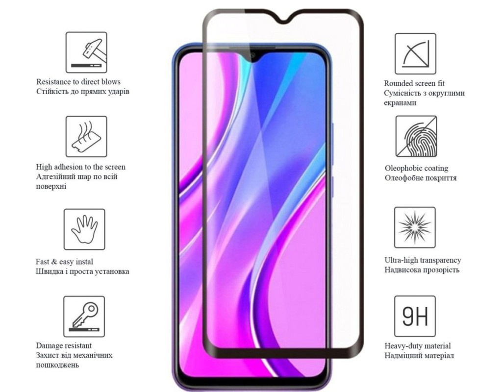 • Панель навколо екрана залита кольором, завдяки чому наклеєне скло практично не відрізнити від стандартної передньої панелі смартфона