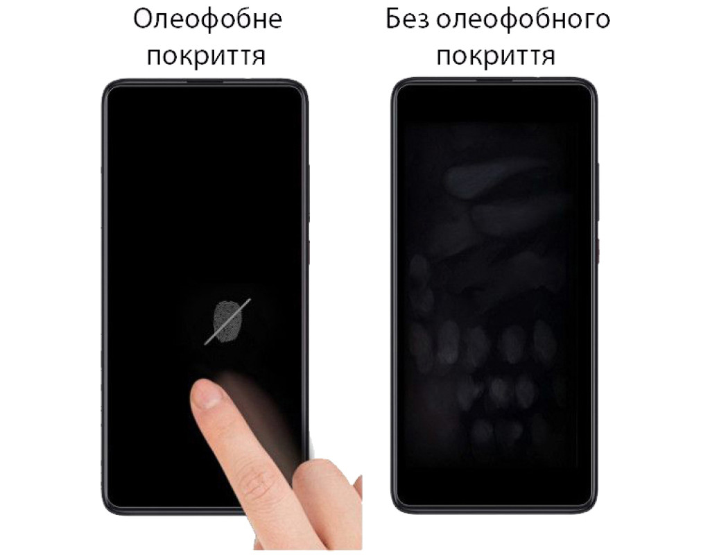 - Наявність олеофобного покриття, завдяки якому на екрані залишається менше слідів від пальців, а скло легко очищається