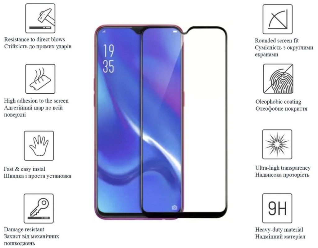 - Панель навколо екрана залита кольором, завдяки чому наклеєне скло практично не відрізнити від стандартної передньої панелі смартфона.