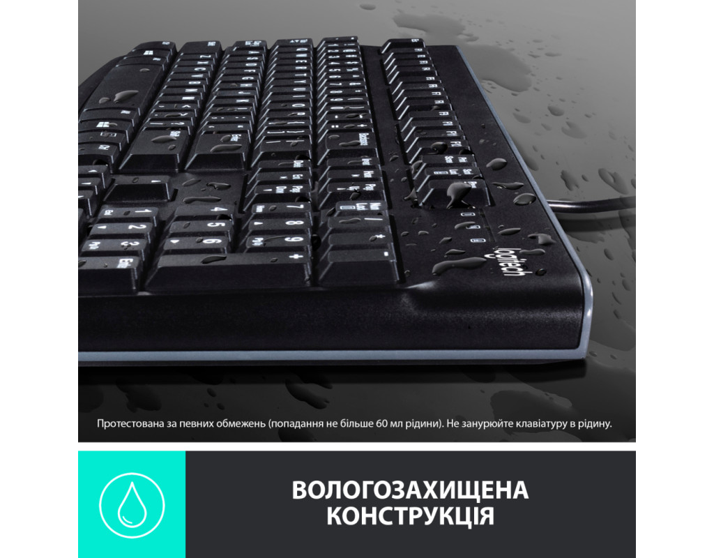 Вологозахищена конструкція*: Рідина витікає з клавіатури, тому вам не доведеться хвилюватися щодо псування устаткування через випадкове потрапляння на нього рідини.