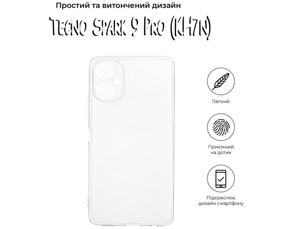 сумісність з моделями - Tecno Spark 9 Pro, Тип чохла для телефону - накладка, Призначення - модельний, Матеріал - силікон, Колір - прозорий