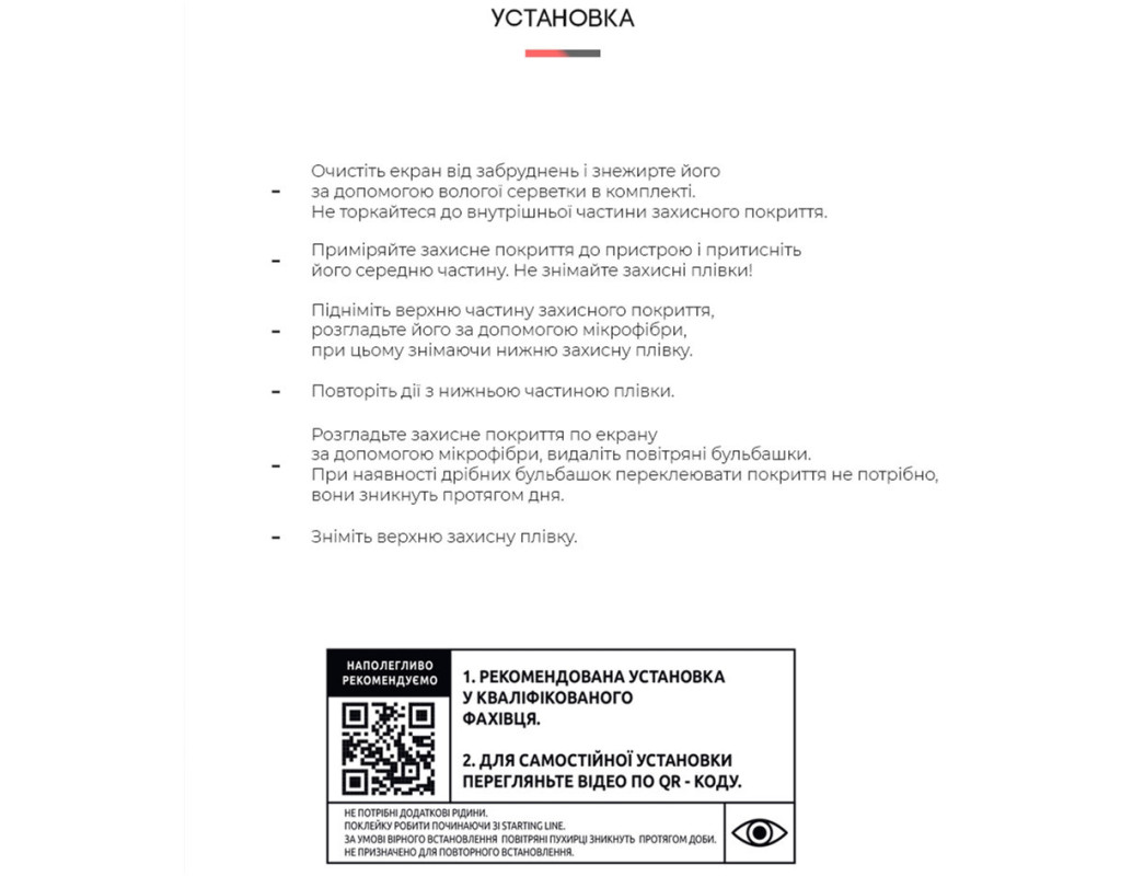 Інструкція для самостійного встановлення: - Очистіть екран від забруднень і знежирте його за допомогою вологої серветки в комплекті. Намагайтеся не торкатися внутрішньої частини захисного покриття.