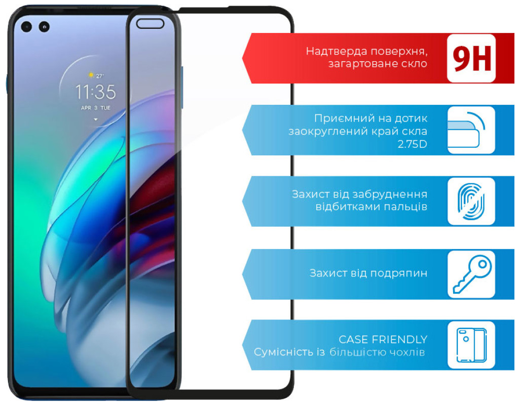 - Рівень міцності: 9H. Мінімізує ризик пошкодження передньої панелі мобільного пристрою під час повсякденного використання.