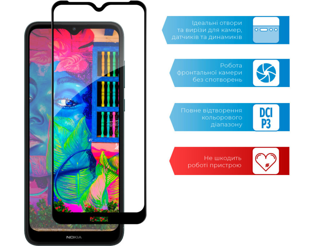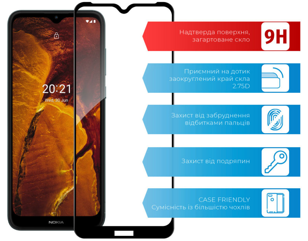 Захисне загартоване скло — один із найкращих засобів захисту не тільки екрана, але й усієї передньої панелі мобільного пристрою, від краю до краю. Воно повністю повторює розміри та форму передньої панелі смартфонів навіть із закругленими краями. Краї скла повторюють колір передньої панелі, тому скло майже невидиме для ока. Скло надійно оберігає від ударів або падінь. Ключові особливості: