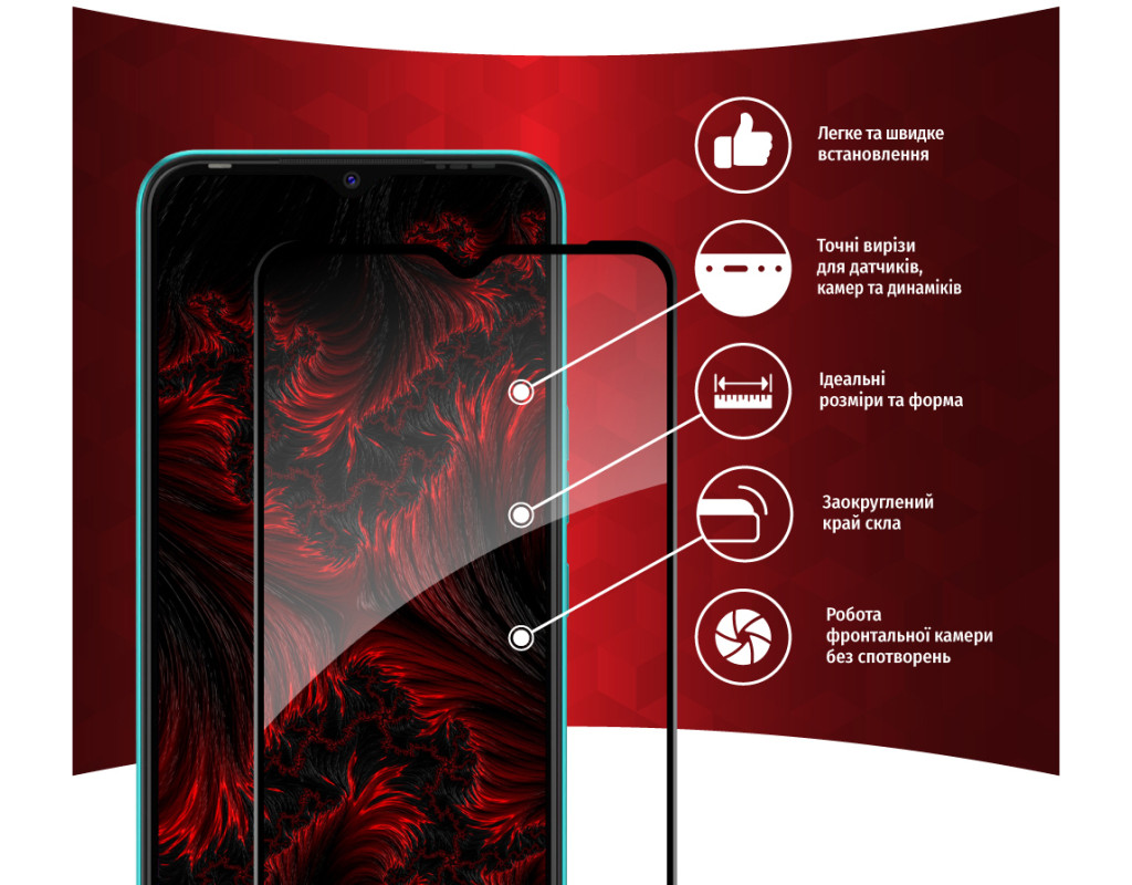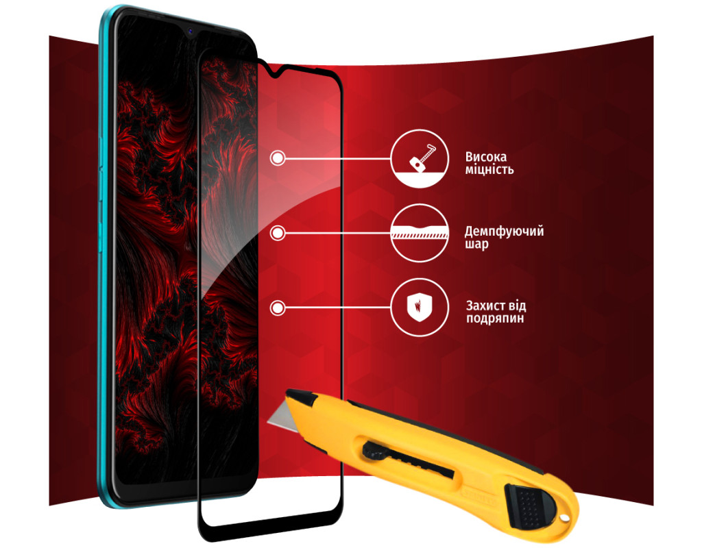 - Рівень міцності 9H — мінімізує ризик пошкодження передньої панелі мобільного пристрою під час повсякденного використання