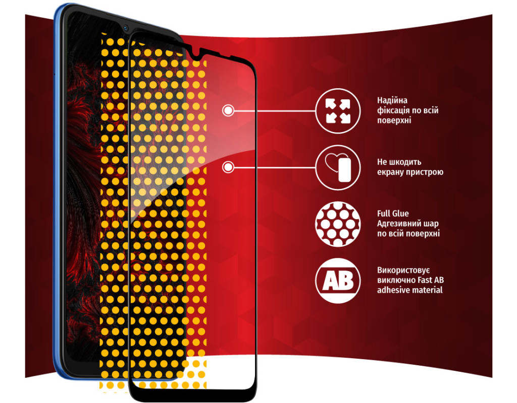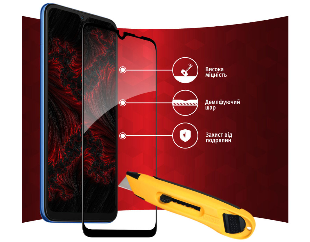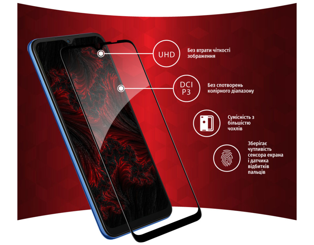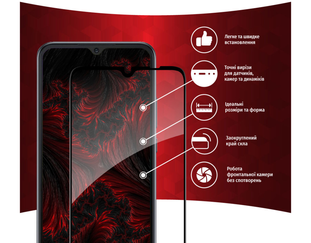 Захисне загартоване скло — один із найкращих засобів захисту не тільки екрана, але й усієї передньої панелі мобільного пристрою, від краю до краю. Воно повністю повторює розміри та форму передньої панелі смартфонів навіть із закругленими краями. Краї скла повторюють колір передньої панелі, тому скло майже невидиме для ока. Скло надійно оберігає від ударів або падінь. Ключові особливості: