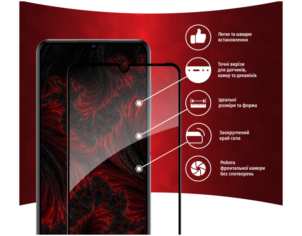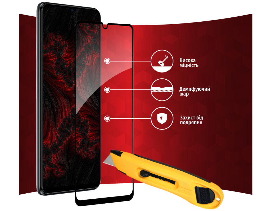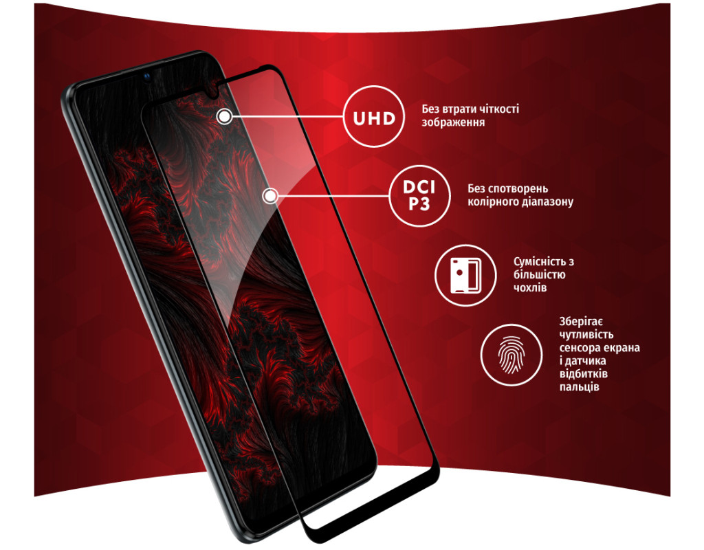 • Рівень міцності 9H — мінімізує ризик пошкодження передньої панелі мобільного пристрою під час повсякденного використання