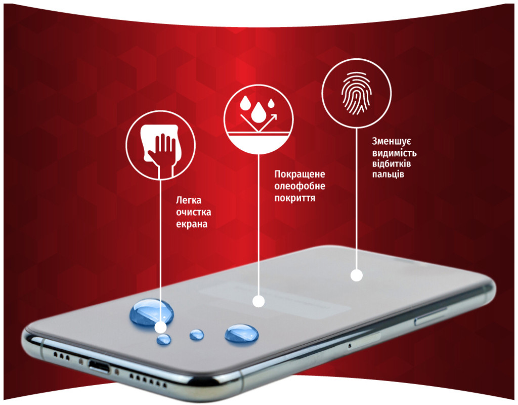 • Олеофобне покриття — скло водовідштовхувальні, жиростійкі й антикорозійні властивості. Зменшує видимість відбитків пальців і дає змогу легко чистити екран