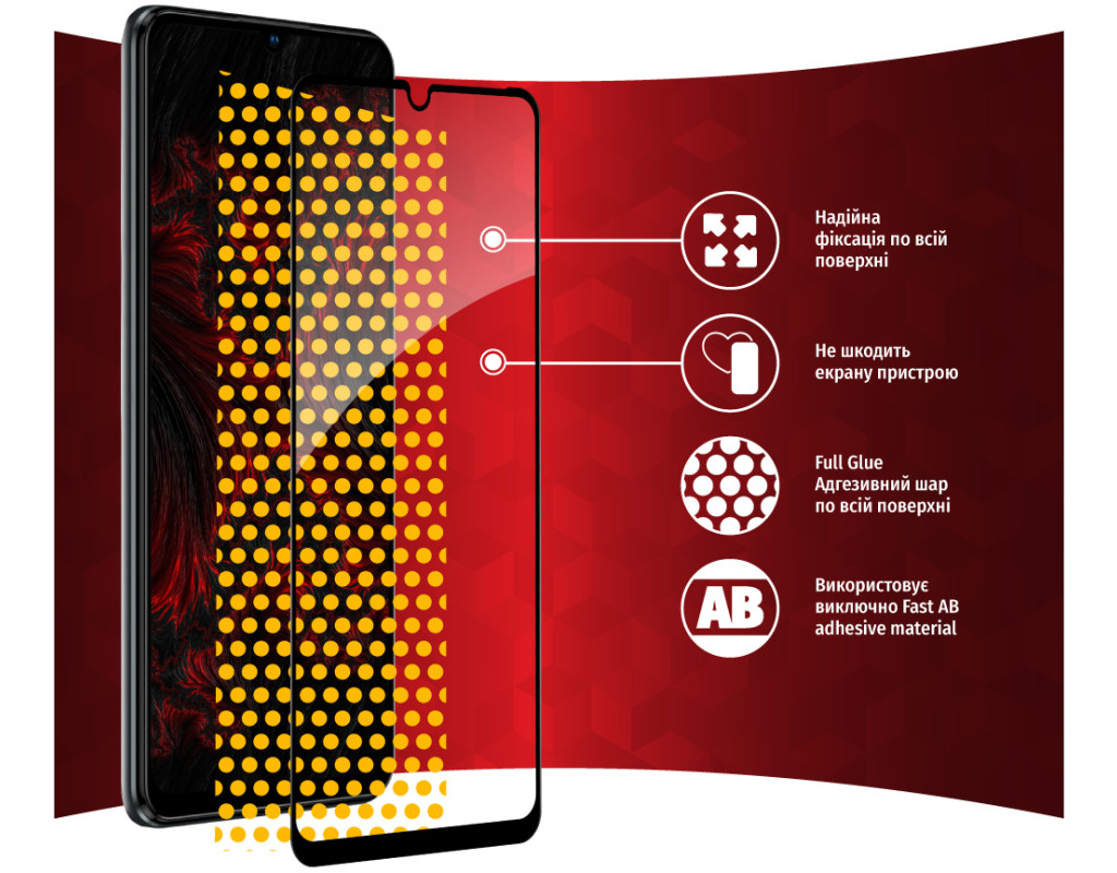 • Клейовий шар нанесений на всьому склі. Завдяки цьому, забезпечує надійну та сильну фіксацію всього скла, а не лише його країв. У разі потреби таке скло можна легко зняти без ризику пошкодити екран або його покриття