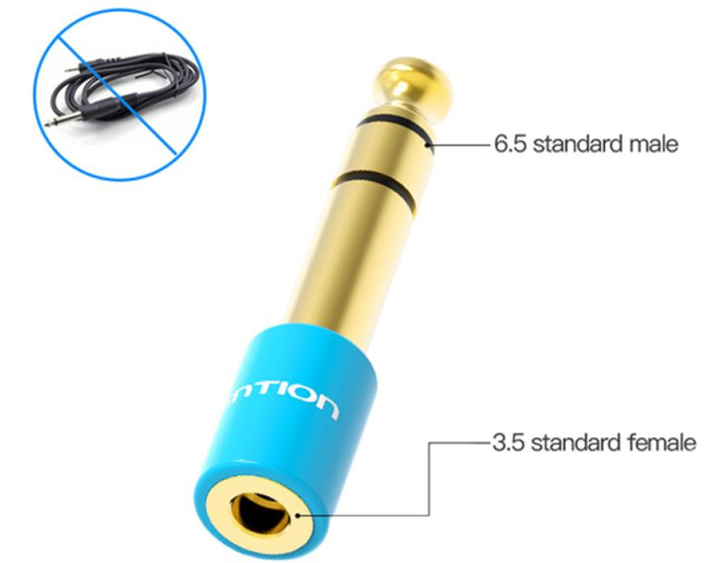 | Перехідник Vention 6.5 мм Male to 3.5 мм Female (VAB-S01-L) дозволяє використовувати навушники із звичайним штекером 3.5 мм у пристроях із роз’ємом 6.35 мм.