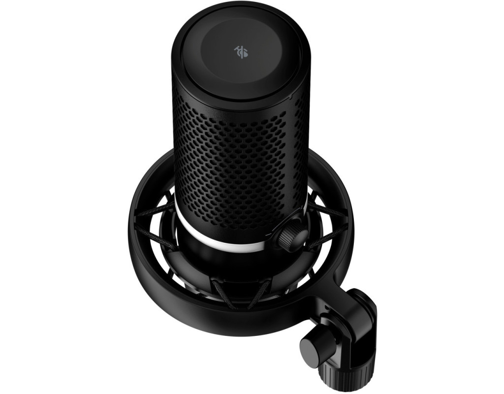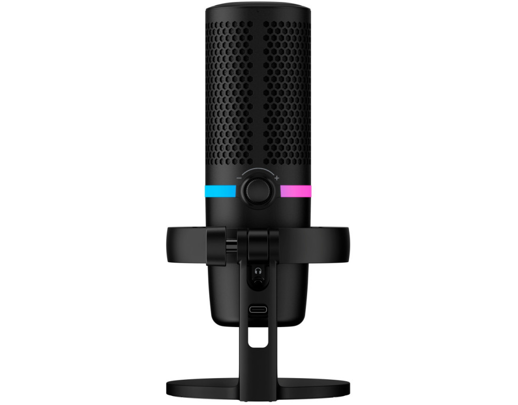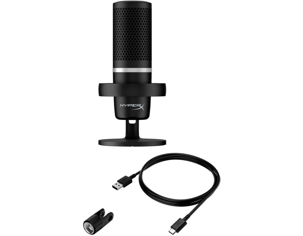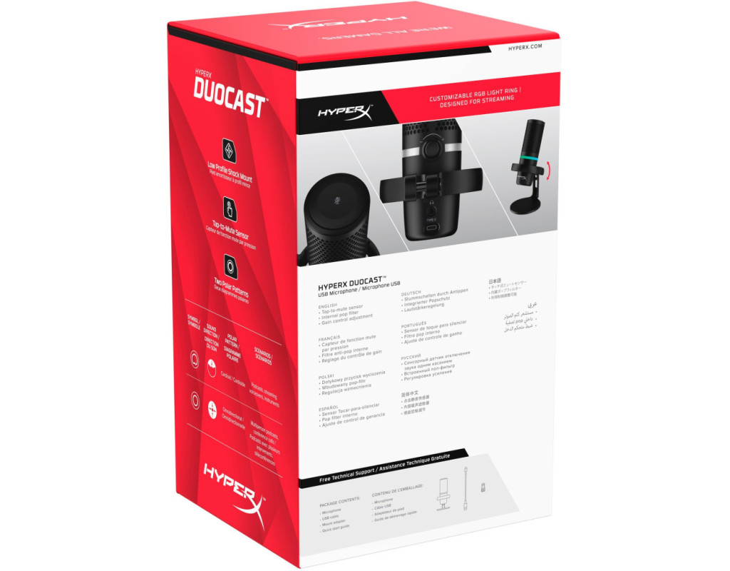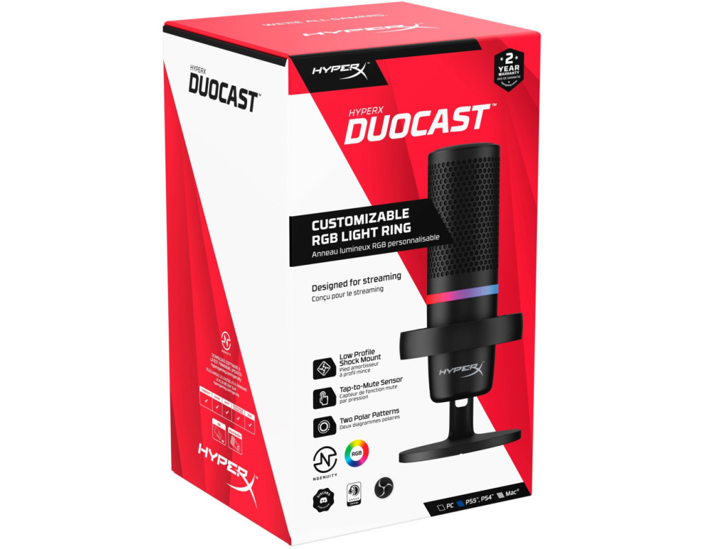 USB мікрофон DuoCast розроблений з урахуванням вимог професійних або стримерів-початківців на ПК, PS5TM, PS4TM і Mac. DuoCast оцифровує Hi-Res звук з 24-бітною роздільною здатністю та частотою дискретизації до 96 кГц, що забезпечує високоякісний та кристально чистий запис голосу. У мікрофоні для чистішого захоплення звуку застосований вбудований поп-фільтр. DuoCast оснащений низькопрофільним амортизатором, легкодоступним регулятором рівня, можливістю вибору з двох діаграм спрямованості – кардіоїдної та ненаправленої – та функцією відключення звуку торканням зі зручною світлодіодною індикацією стану мікрофона. DuoCast також обладнаний кільцем з RGB підсвічуванням, яке можна налаштувати за допомогою програмного забезпечення HyperX NGENUITY. |