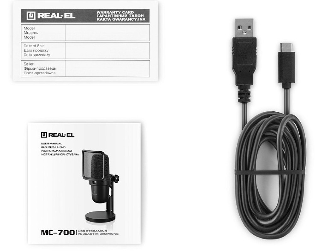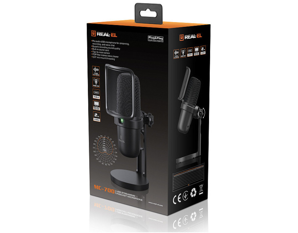 Якісний мікрофон — невід'ємна складова гарного підкасту та озвучування відео. Професійний аудіо мікрофон REAL-EL MC-700 призначений для потокової передачі, запису та голосового чату. Завдяки вбудованій звуковій карті та наявності POP фільтру MC-700 відрізняє висока якість запису звуку. Кардіоїдна спрямованість забезпечує відсутність сторонніх звуків та шумів під час запису. Підставка з регулюванням кута нахилу, сенсорна кнопка для відключення запису та світлодіодний індикатор роблять роботу з мікрофоном простою, комфортною та зручною. Також передбачено роз'єм з різьбленням для кріплення мікрофона на стандартну студійну стійку або тримач. Мікрофон REAL-EL MC-700 - це чистий, об'ємний звук та комфортний універсальний форм-фактор.