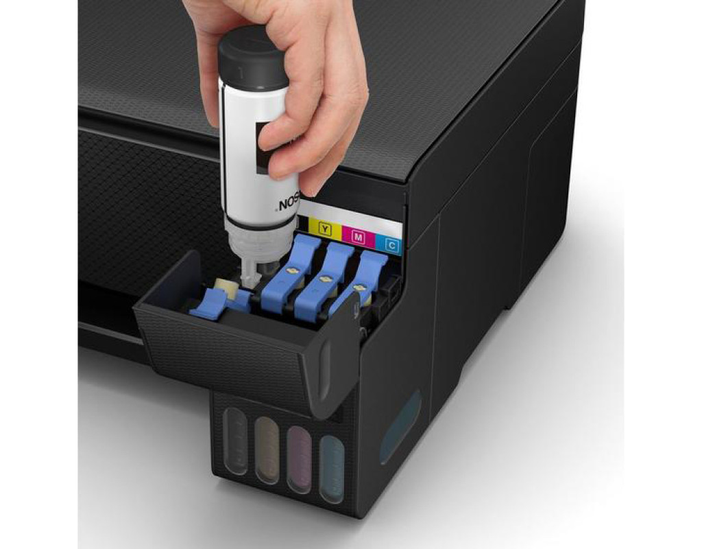 | Домашній принтер із резервуаром для чорнил Попрощайтеся з дороговартісними картриджамиEcoTank забезпечує легкий та недорогий друк удома: резервуари для чорнил підвищеної місткості створені для простого заправляння, а конструкція контейнерів із замками дає змогу доливати чорнила лише потрібних кольорів. Суцільна економіяЦей принтер EcoTank забезпечує значну економію витрат на друк, адже до комплекту поставки входить запас чорнила на період до 3 років⁴. Комплект змінних контейнерів забезпечує друк до 4500 чорно-білих або 7500 кольорових сторінок. Різноманітність функційЗавдяки функціям друку, сканування й копіювання, а також друку фотографій без полів (до 10 x 15 см), ви можете легко та швидко виконати низку завдань. |