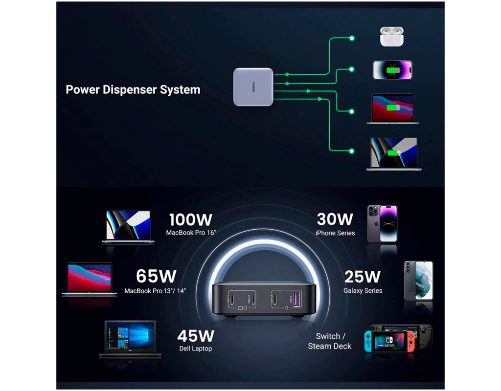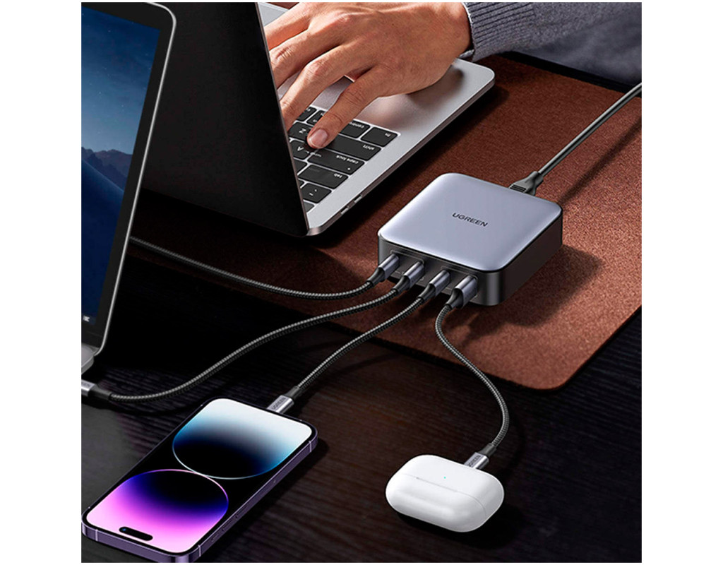 | Зарядний пристрій UGREEN 4xUSB 100W (3xType-C+USB A QC3) GAN Charger Nexode Series Black CD328 (90928) — це інноваційний адаптер, який відкриває нові горизонти заряджання. З його допомогою ви зможете заряджати до чотирьох пристроїв одночасно, що робить його ідеальним вибором для активних користувачів вдома чи в офісі. Дана модель підтримує сумарну потужність у 100 Вт, дозволяючи швидко заряджати ноутбуки, смартфони, планшети та інші пристрої. Унікальні технології GaN і SiC забезпечують не лише компактні розміри, але й високу енергоефективність. Це дозволяє пристрою працювати з максимальною продуктивністю, розсіюючи тепло та зберігаючи енергію. Багаторівневий захист гарантує безпеку від перенапруги, коротких замикань, перевантаження та перегріву, зберігаючи ваші пристрої в безпеці. Завдяки розширеній сумісності, UGREEN CD328 може заряджати різноманітні бренди, такі як Apple, Huawei, Xiaomi, Samsung і навіть ігрові консолі Nintendo Switch та Steam Deck. Оснащений 3 портами USB-C та 1 портом USB-A, зарядний пристрій підтримує сучасні протоколи швидкої зарядки, включаючи Power Delivery 3.0, Quick Charge 4.0 та Programmable Power Supply (PPS), що дозволяє заряджати ваші гаджети на 50% всього за 30 хвилин. Цей зарядний пристрій — ваш незамінний помічник у швидкісному заряджанні, що поєднує в собі високу якість, надійність та безпеку. Оцініть переваги використання UGREEN CD328 і насолоджуйтесь універсальністю, яку він пропонує для кожного вашого пристрою. |