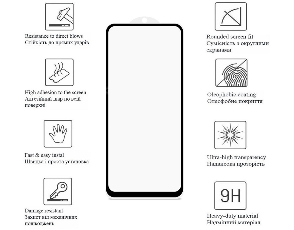 - Панель навколо екрана залита кольором, завдяки чому наклеєне скло практично не відрізнити від стандартної передньої панелі смартфона.
