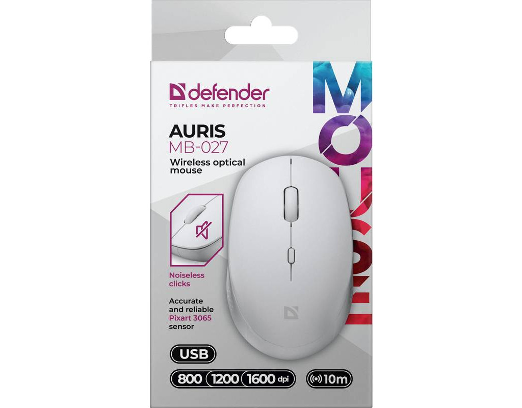 Мишка Defender Auris MB-027, бездротова, 3 кн. до 1600 dpi, безшумна, біла