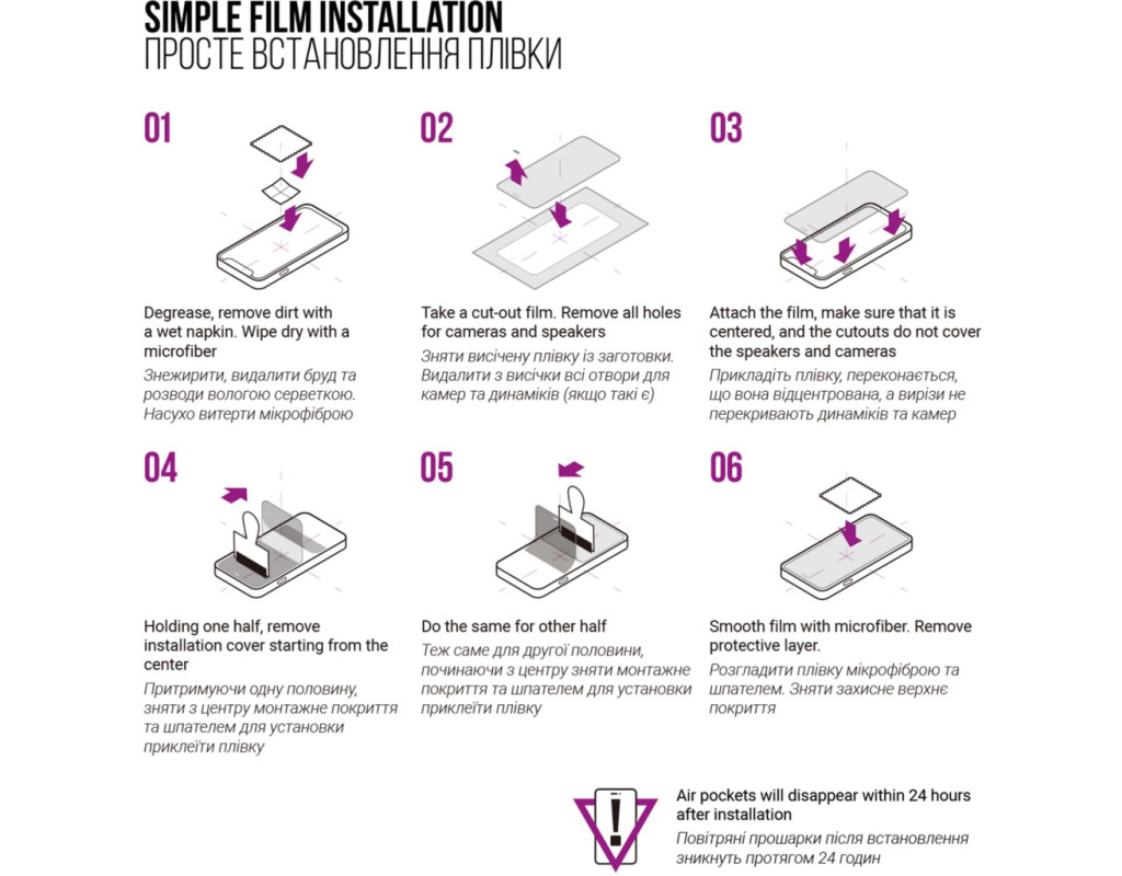 6. Розгладити плівку мікрофіброю та шпателем. Зняти верхнє захисне покриття.
