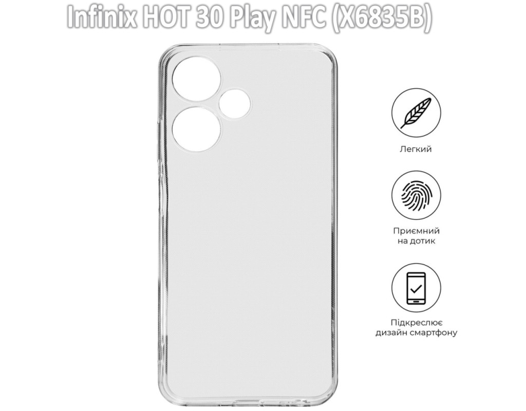 сумісність з моделями - Infinix Hot 30 Play NFC, Тип чохла для телефону - накладка, Призначення - модельний, Матеріал - силікон, Колір - прозорий