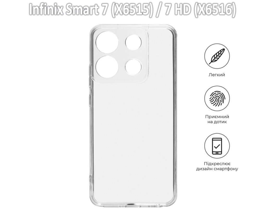 сумісність з моделями - Infinix Smart 7, Infinix Smart 7 HD, Тип чохла для телефону - накладка, Призначення - модельний, Колір - прозорий