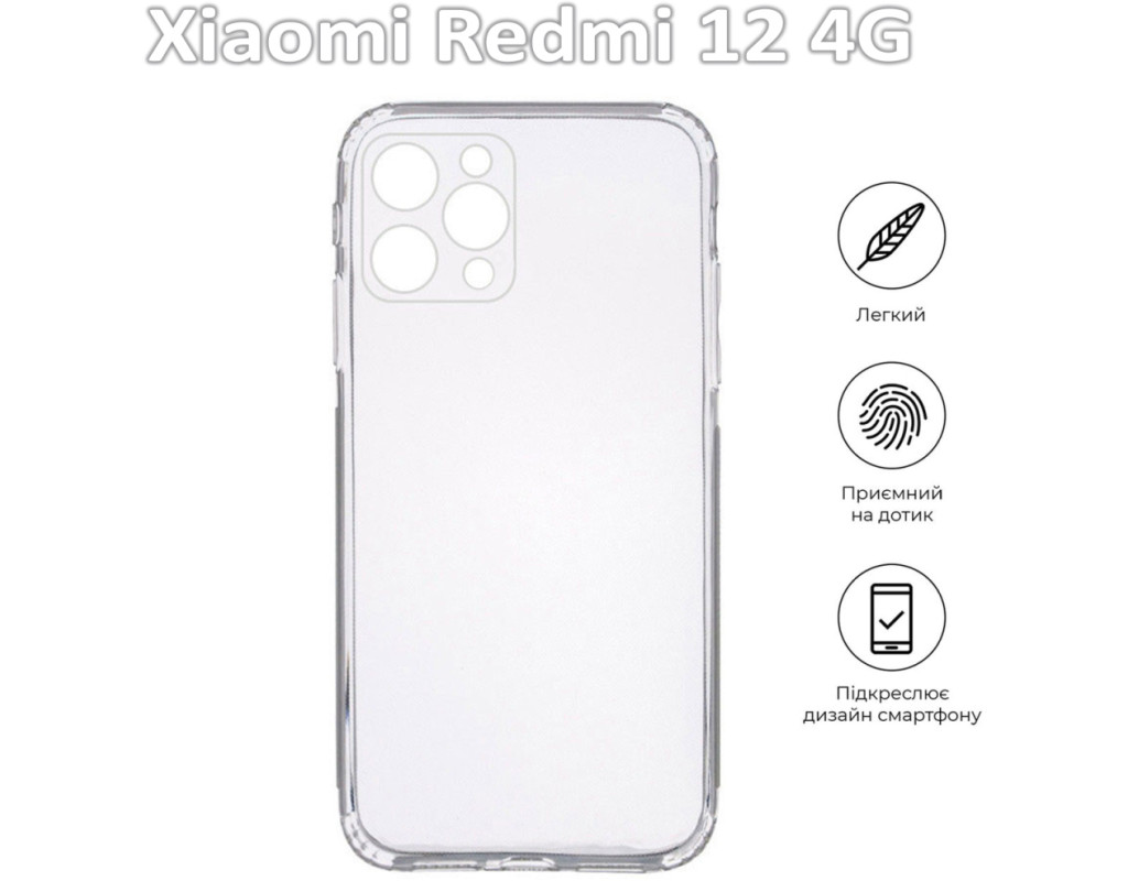 сумісність з моделями - Xiaomi Redmi 12, Тип чохла для телефону - накладка, Призначення - модельний, Матеріал - силікон, Колір - прозорий
