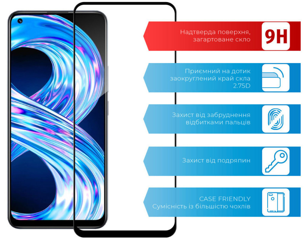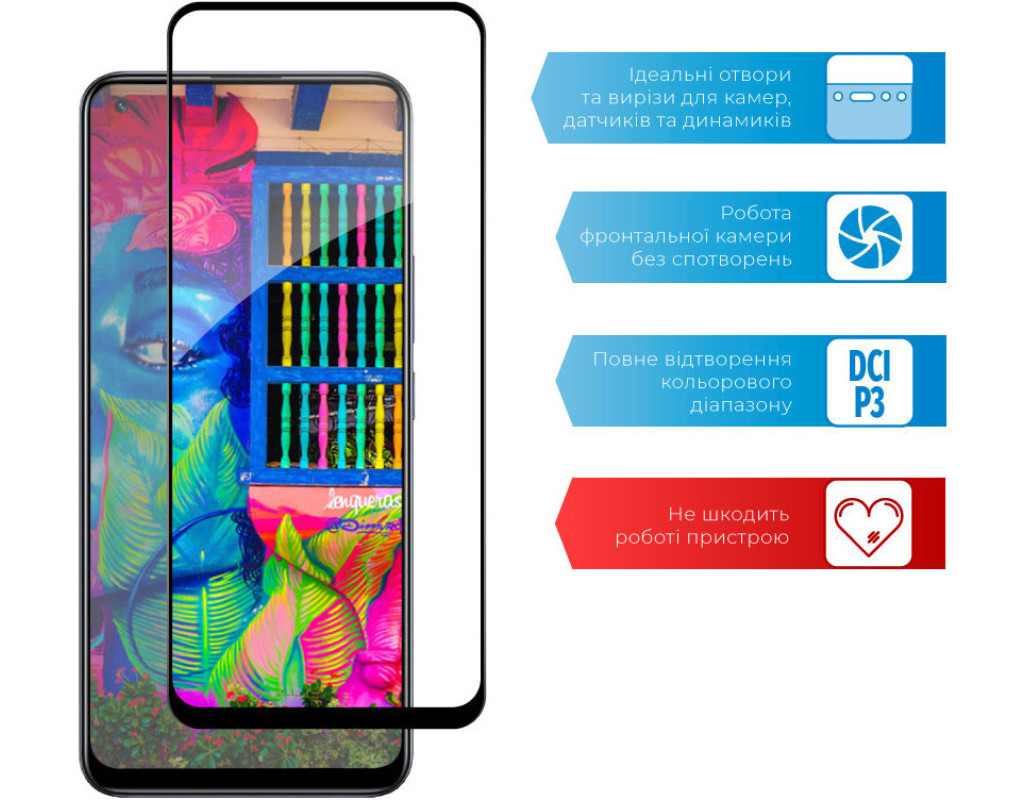 Захисне загартоване скло — один із найкращих засобів захисту не тільки екрана, але й усієї передньої панелі мобільного пристрою, від краю до краю. Воно повністю повторює розміри та форму передньої панелі смартфонів навіть із закругленими краями. Краї скла повторюють колір передньої панелі, тому скло майже невидиме для ока. Скло надійно оберігає від ударів або падінь. Ключові особливості: