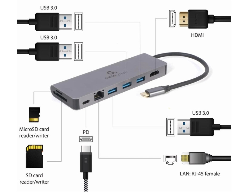 Тип - зовнішній, Інтерфейс підключення - USB 3.0, Вихідні роз'єми - 1 х RJ45, 1 x USB Type C, 3 x USB 3.1, microSD, 2 x HDMI