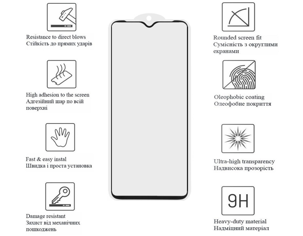 Захисне скло Drobak Frame A+ Full Glue – це нове високоефективне рішення для захисту екрана вашого смартфона від подряпин, тріщин та сколів, виготовлене з інноваційного загартованого скла, дуже міцне, щоб захистити екран телефону під час падіння на асфальт, при побутових ударах, при взаємодії з предметами, що дряпають (ключі, пісок, лезо ножа, цвяхи тощо). Інноваційне загартоване скло проходить кілька етапів спеціальної термообробки. Водночас захисне скло Drobak досить тонке та практично непомітне на екрані. Повністю не впливає на чутливість сенсора смартфона. Також скло, з якого виготовлена накладка, пропускає 98% світла, виключаючи втрату яскравості та якості зображення екрана девайса. Особлива форма скла виконана відповідно до особливостей смартфона. Захисне скло Drobak Frame A+ Full Glue — це якісний, практичний у використанні аксесуар, який допоможе уникнути дорогої процедури заміни екрану смартфона, збереже дисплею його первинний зовнішній вигляд. Особливості скла: