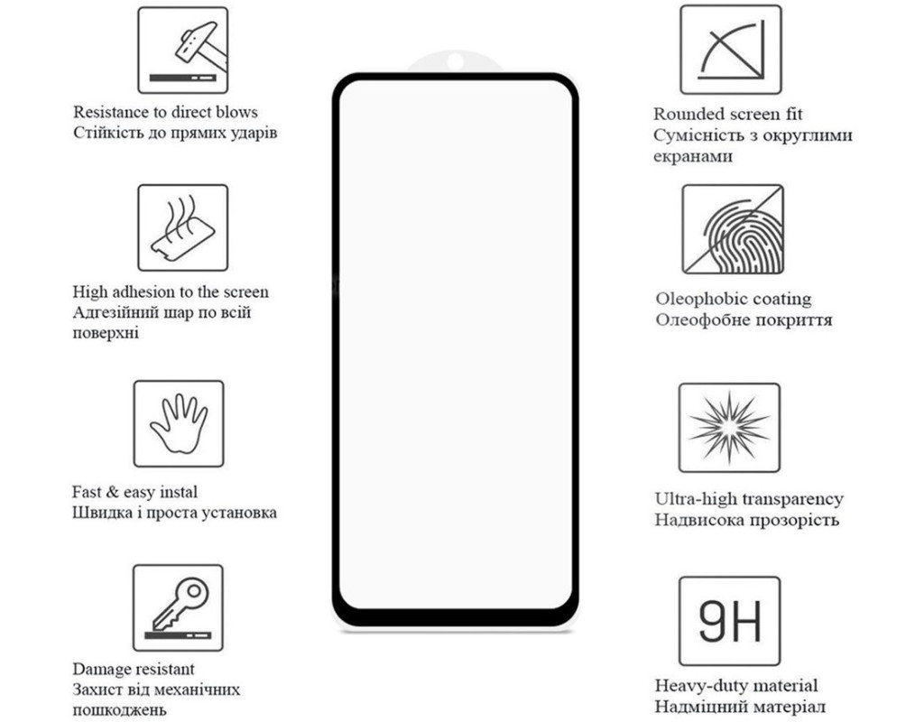 - 9H-твердість матеріалу із загартованого скла посилює стійкість проти ударів та подряпин.