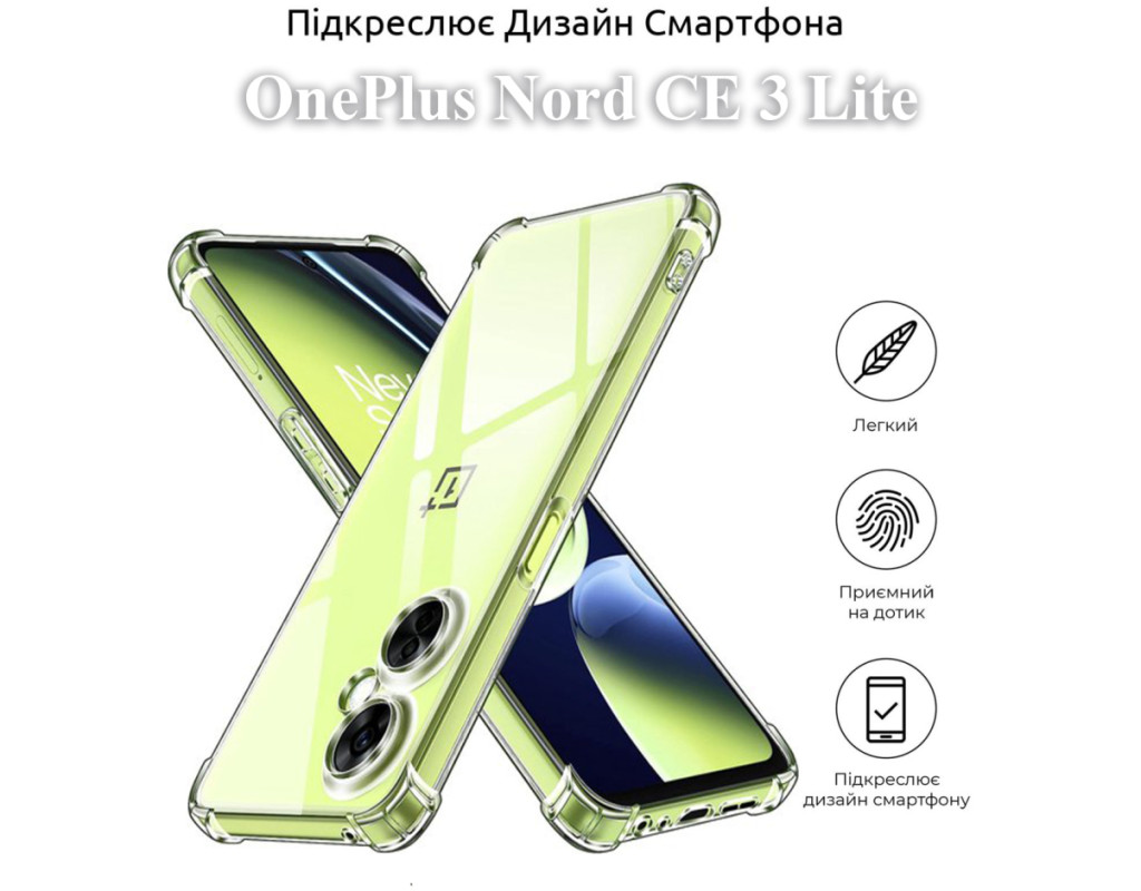 сумісність з моделями - OnePlus Nord CE 3 Lite, Тип чохла для телефону - накладка, Призначення - модельний, Колір - прозорий