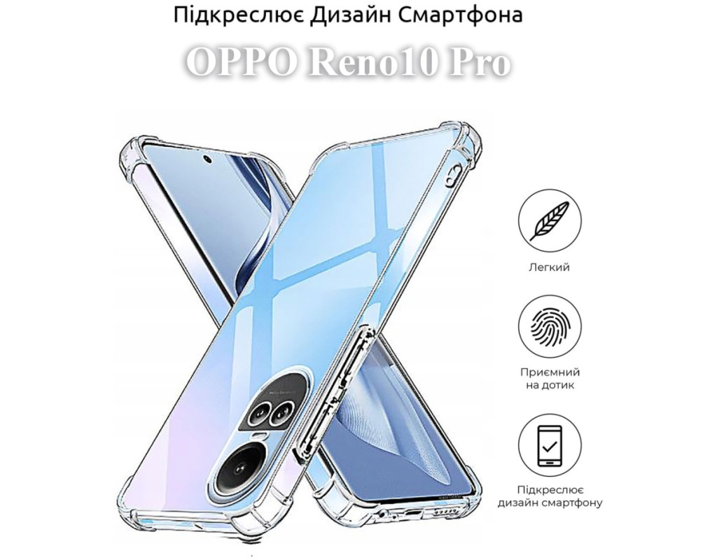 сумісність з моделями - OPPO Reno10 Pro, Тип чохла для телефону - накладка, Призначення - модельний, Колір - прозорий