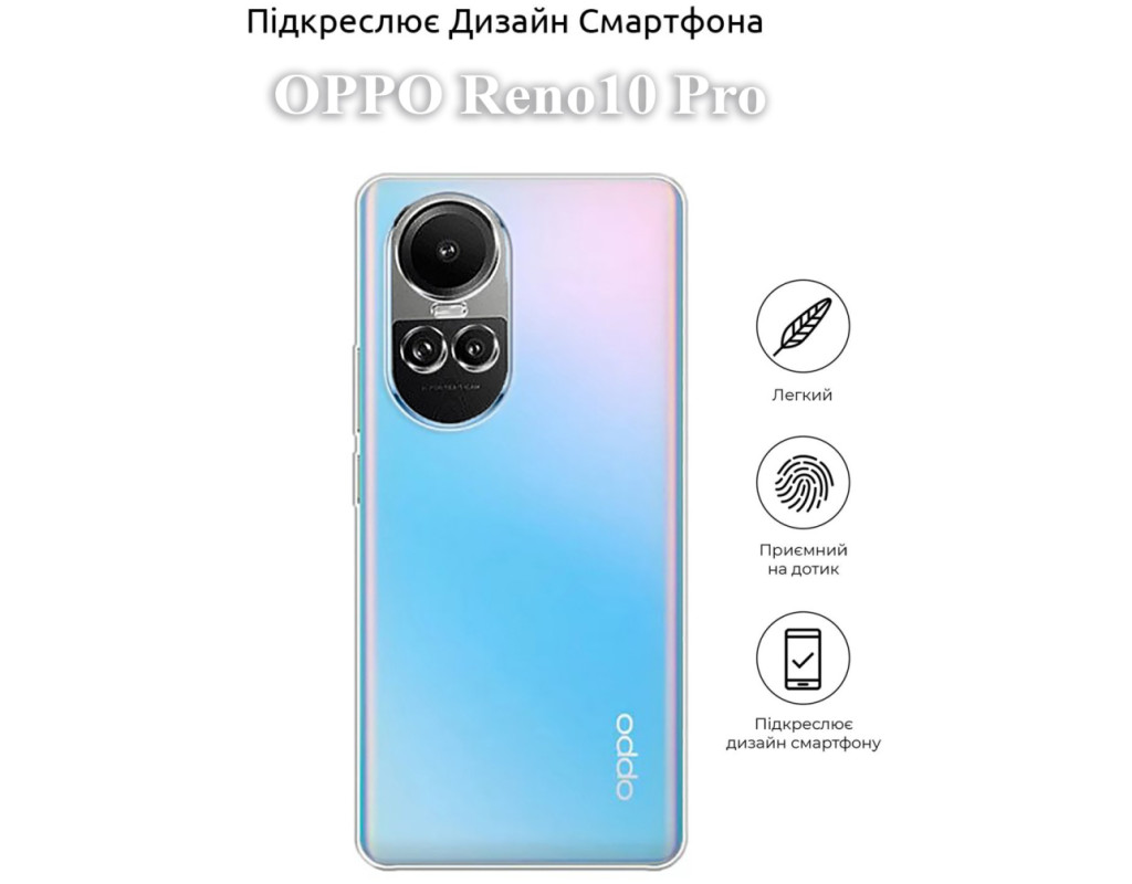 сумісність з моделями - OPPO Reno10 Pro, Тип чохла для телефону - накладка, Призначення - модельний, Матеріал - силікон, Колір - прозорий