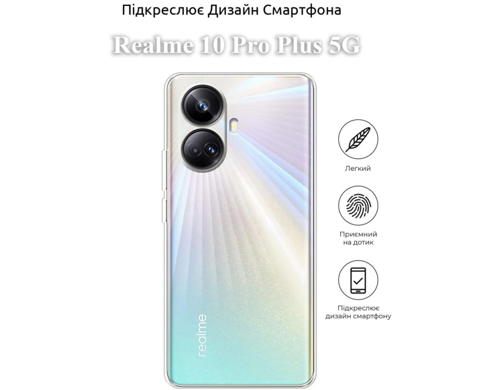 сумісність з моделями - Realme 10 Pro Plus 5G, Тип чохла для телефону - накладка, Призначення - модельний, Колір - прозорий