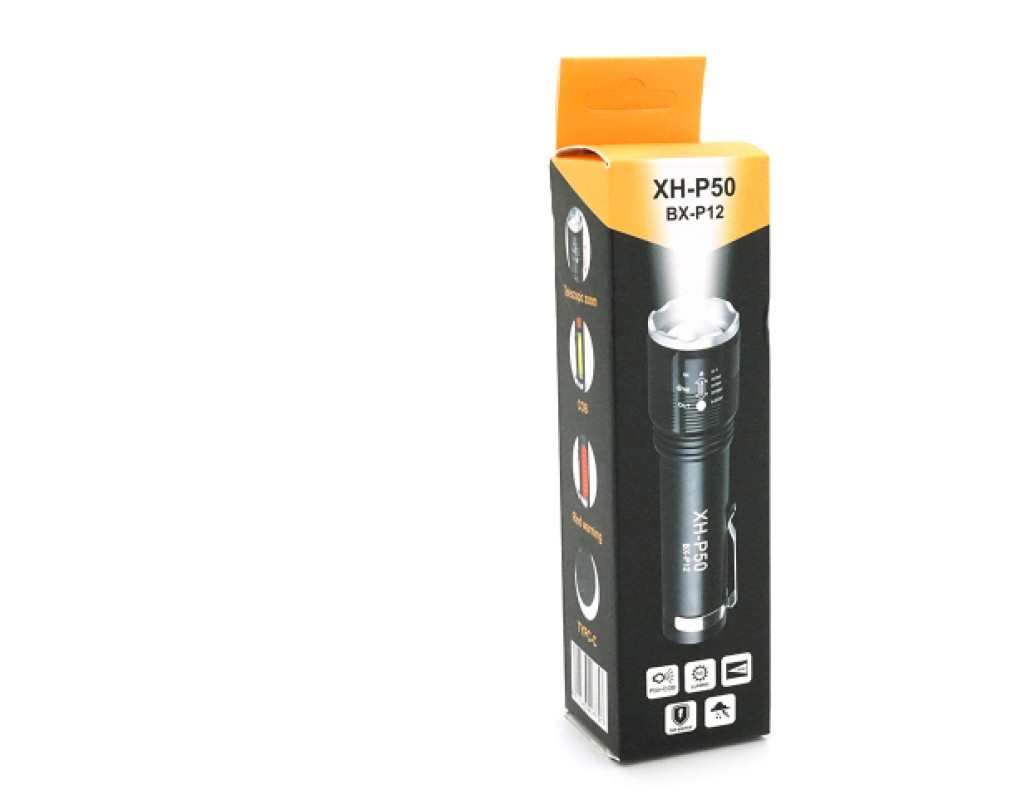 Ліхтарик XP-P50-P12 є портативним ліхтариком з алюмінієвим корпусом, вбудованим акумулятором і USB кабелем. Він має 3+1 режим роботи і поставляється в коробці. |