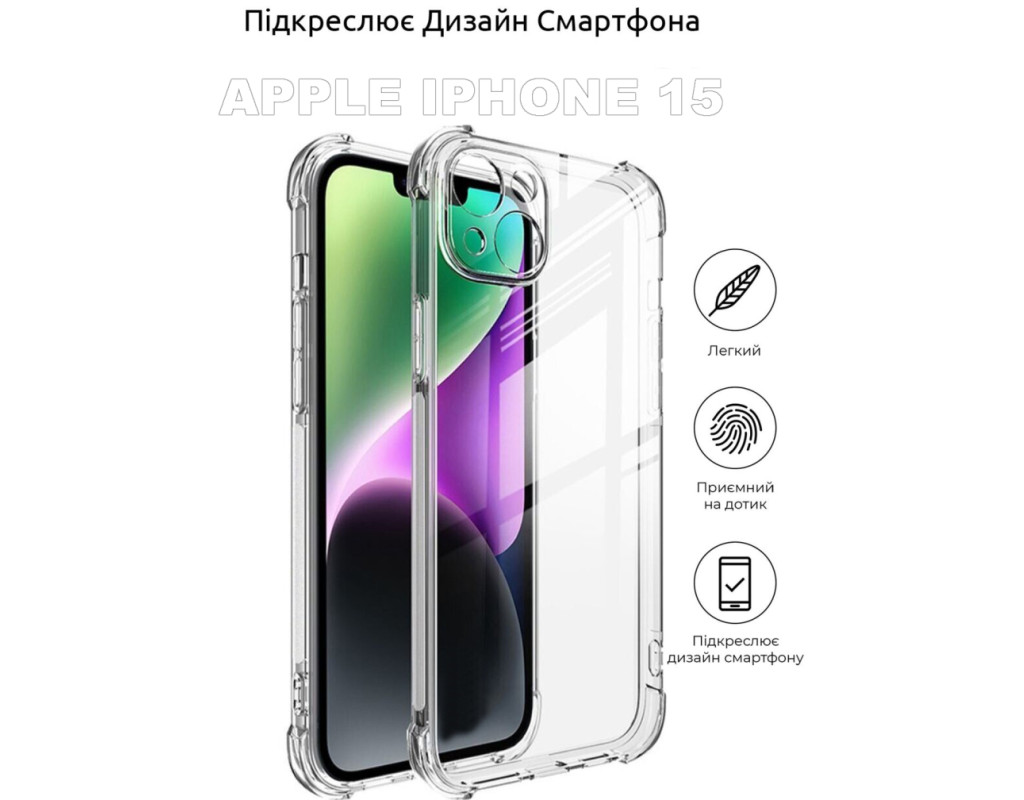 сумісність з моделями - Apple iPhone 15, Тип чохла для телефону - накладка, Призначення - модельний, Колір - прозорий