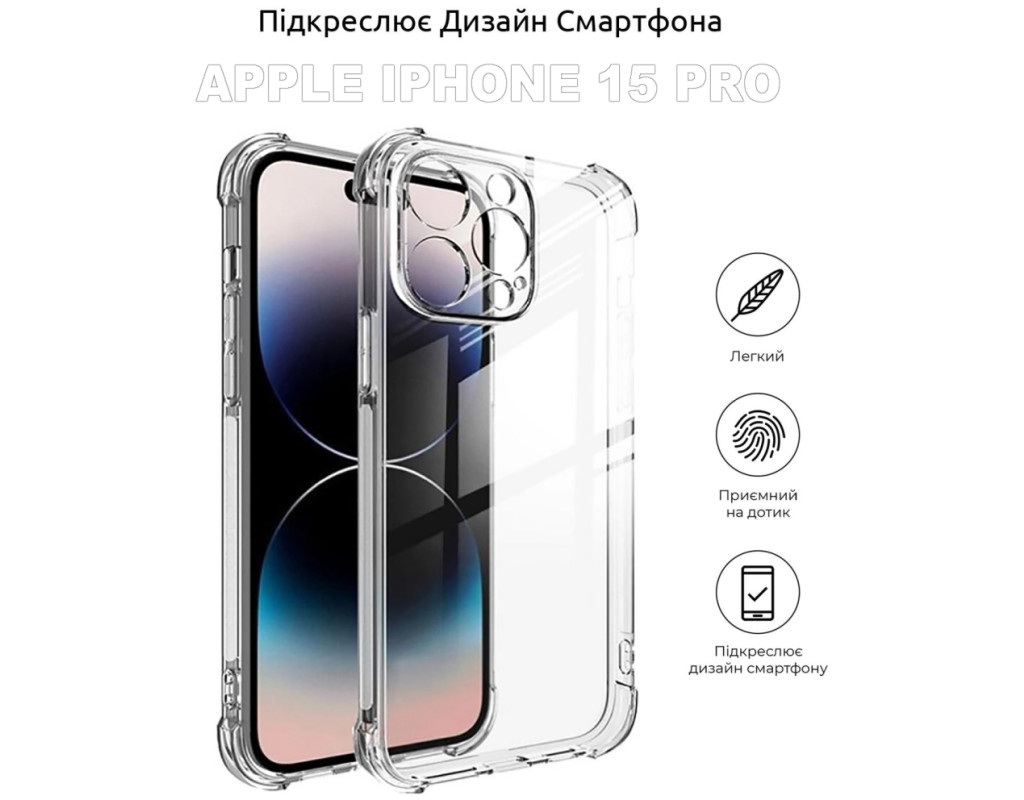 сумісність з моделями - Apple iPhone 15 Pro, Тип чохла для телефону - накладка, Призначення - модельний, Колір - прозорий