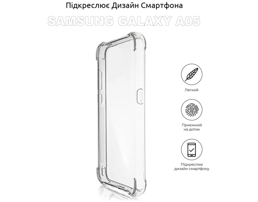 сумісність з моделями - Samsung Galaxy A05, Тип чохла для телефону - накладка, Призначення - модельний, Колір - прозорий