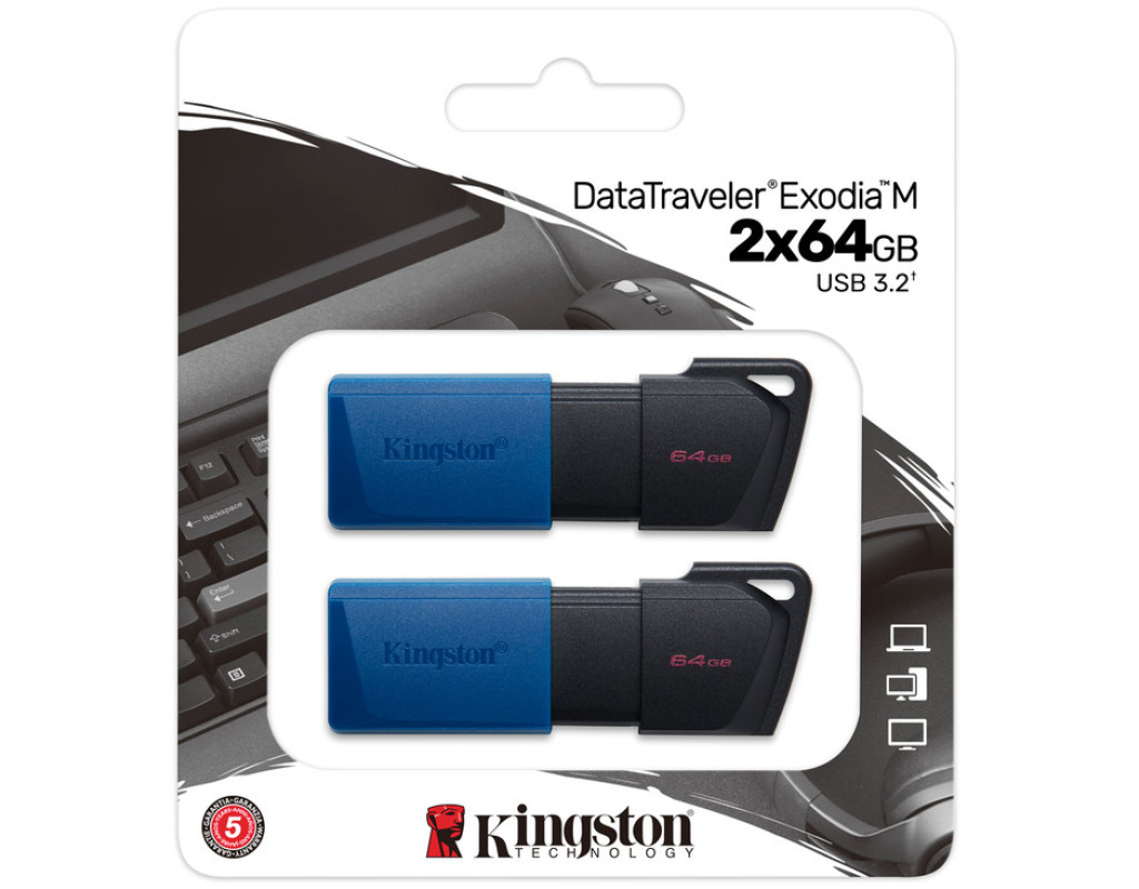 | Комплект із двох USB накопичувачів DataTraveler Exodia M від компанії Kingston забезпечує недороге надійне зберігання та транспортування повсякденних даних для більшості користувачів. Він має у своєму розпорядженні достатній обсяг пам'яті, щоб можна було взяти з собою не тільки робочі файли, але і фотографії, і улюблену музику. Також він буде зручним для оперативного перенесення даних між ПК, ноутбуками, моніторами, телевізорами, медіаплеєрами та іншими цифровими пристроями, оснащеними портами USB Type-A. Практичний та стильний дизайн накопичувача DataTraveler Exodia M добре поєднується з іншими пристроями. Накопичувач оснащений інтерфейсом USB 3.2 Gen 1, тому легко може працювати практично з будь-якими пристроями від новітніх ПК до, наприклад, медіаплеєрів колишніх поколінь. Накопичувач забезпечений п'ятирічною гарантією, безкоштовною технічною підтримкою та відрізняється легендарною надійністю Kingston. |