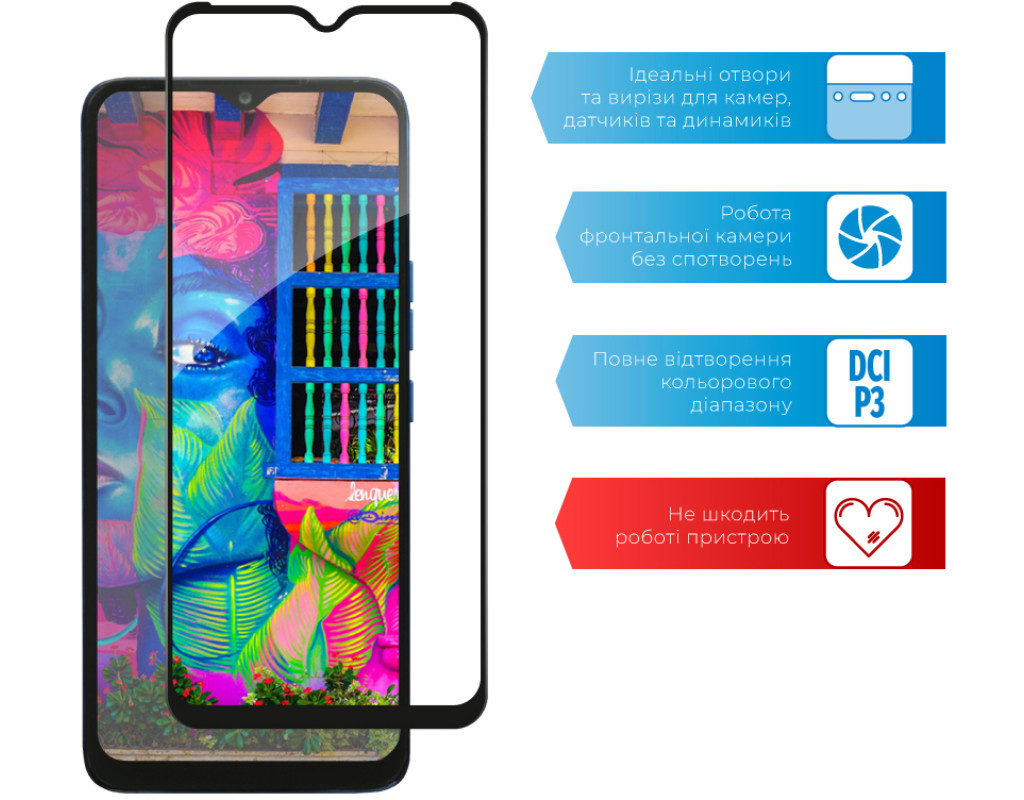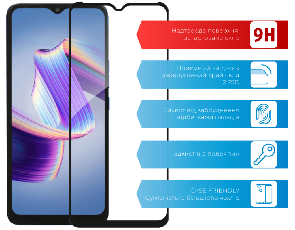 - Рівень міцності 9H — мінімізує ризик пошкодження передньої панелі мобільного пристрою під час повсякденного використання